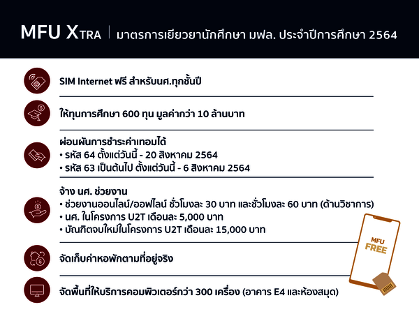 นักศึกษาสามารถดูรายละเอียดมาตรการความช่วยเหลือได้ที่ www.mfu.ac.th/student-support-covid-19.html