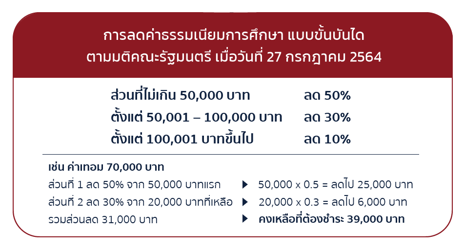 ทั้งนี้ มหาวิทยาลัยแม่ฟ้าหลวง (มฟล.) จะดำเนินการลดค่าธรรมเนียมการศึกษาให้กับนักศึกษาสัญชาติไทย ทุกระดับการศึกษา ตามมาตรการของที่ประชุมอธิการบดีแห่งประเทศไทย (ทปอ.) ซึ่งจะเป็นการปรับลดแบบขั้นบันได โดยลดค่าธรรมเนียมการศึกษา 50% สำหรับ 50,000 บาทแรก ส่วนที่เกิน 50,000 บาท (50,001-100,000 บาท) จะได้รับส่วนลด 30% และลด 10% สำหรับค่าเล่าเรียนตั้งแต่ 100,001 บาทขึ้นไป