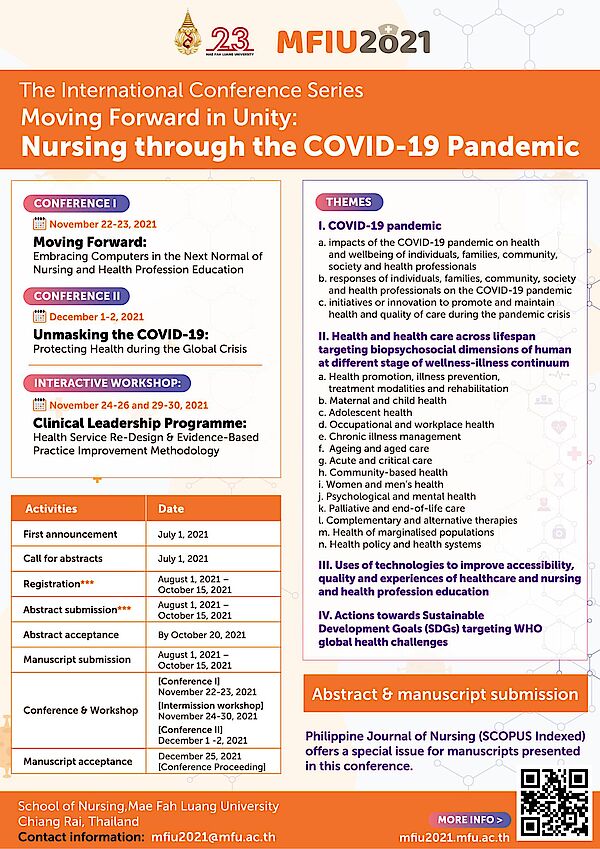 สำนักวิชาพยาบาลศาสตร์ มหาวิทยาลัยแม่ฟ้าหลวง ร่วมกับเครือข่าย กำหนดจัดการประชุมวิชาการระดับนานาชาติ ในรูปแบบออนไลน์ ภายใต้หัวข้อ “Moving Forward in Unity: Nursing through the COVID-19 Pandemic” โดยแบ่งเป็น 2 ช่วง