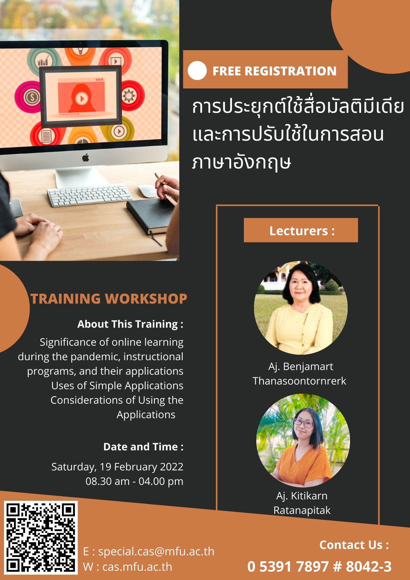 ดังนั้น ศูนย์บริการวิชาการ ขอเชิญครูผู้สอนวิชาภาษาอังกฤษระดับมัธยมศึกษาในจังหวัดเชียงราย และจังหวัดพะเยา เข้าร่วมโครงการ การประยุกต์ใช้สื่อมัลติมีเดียและการปรับใช้ในการสอนภาษาอังกฤษ ในวันเสาร์ที่ 19 กุมภาพันธ์ 2565 ผ่านช่องทางออนไลน์ ด้วยโปรแกรม Zoom Meeting โดยไม่เสียค่าใช้จ่าย ผู้สนใจสามารถลงทะเบียนสมัครเข้าร่วมโครงการ ภายในวันที่ 11 กุมภาพันธ์ 2565 หรือจนกว่าจะเต็ม