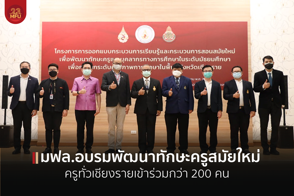 มหาวิทยาลัยแม่ฟ้าหลวง (มฟล.) โดยมูลนิธิมหาวิทยาลัยแม่ฟ้าหลวงเพื่อการพัฒนาครูชนบท, สถาบันนวัตกรรมการเรียนรูู้ และศูนย์บริการวิชาการ จัดโครงการการออกแบบกระบวนการเรียนรู้และกระบวนการสอนสมัยใหม่เพื่อพัฒนาทักษะครูและบุคลากรทางการศึกษาในระดับมัธยมศึกษา เพื่อการยกระดับคุณภาพการศึกษาในพื้นที่จังหวัดเชียงราย เมื่อวันที่ 30 มีนาคม 2565 ที่ห้องคำมอกหลวง อาคาร M- Square มหาวิทยาลัยแม่ฟ้าหลวง และมี ดร.ต่อพันธ์ ทันดร รองอธิการบดี เป็นประธานเปิด ดร.ณัฐวุฒิ ยอดสุวรรณ ผู้อำนวยการศูนย์บริการวิชาการ กล่าวรายงาน โดยมีครูกว่า 120 คน จาก 42 โรงเรียนจากทั่วจังหวัดเชียงรายเข้าร่วมกิจกรรม