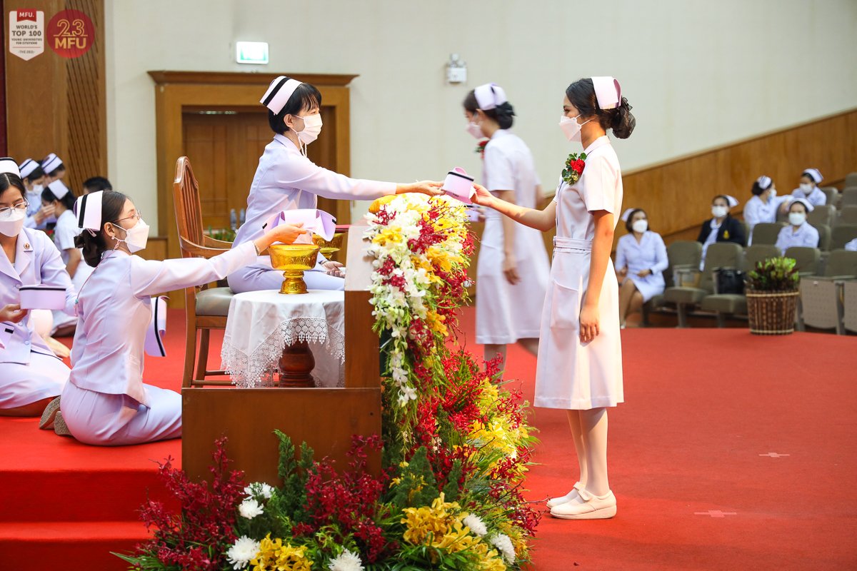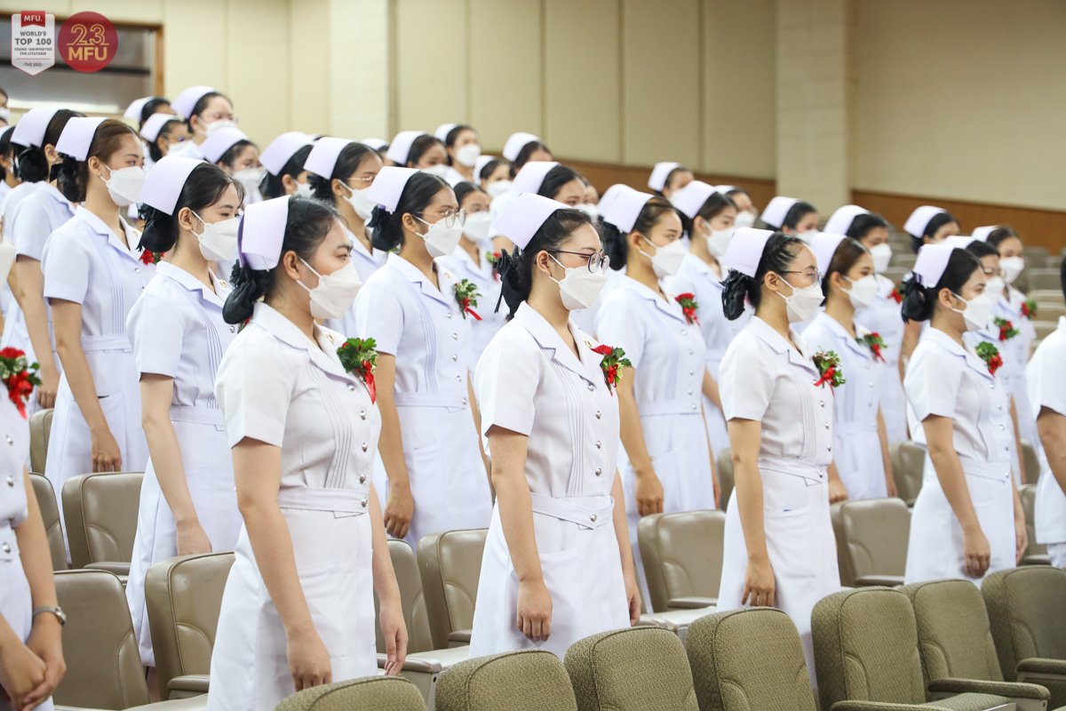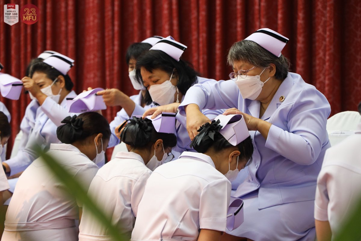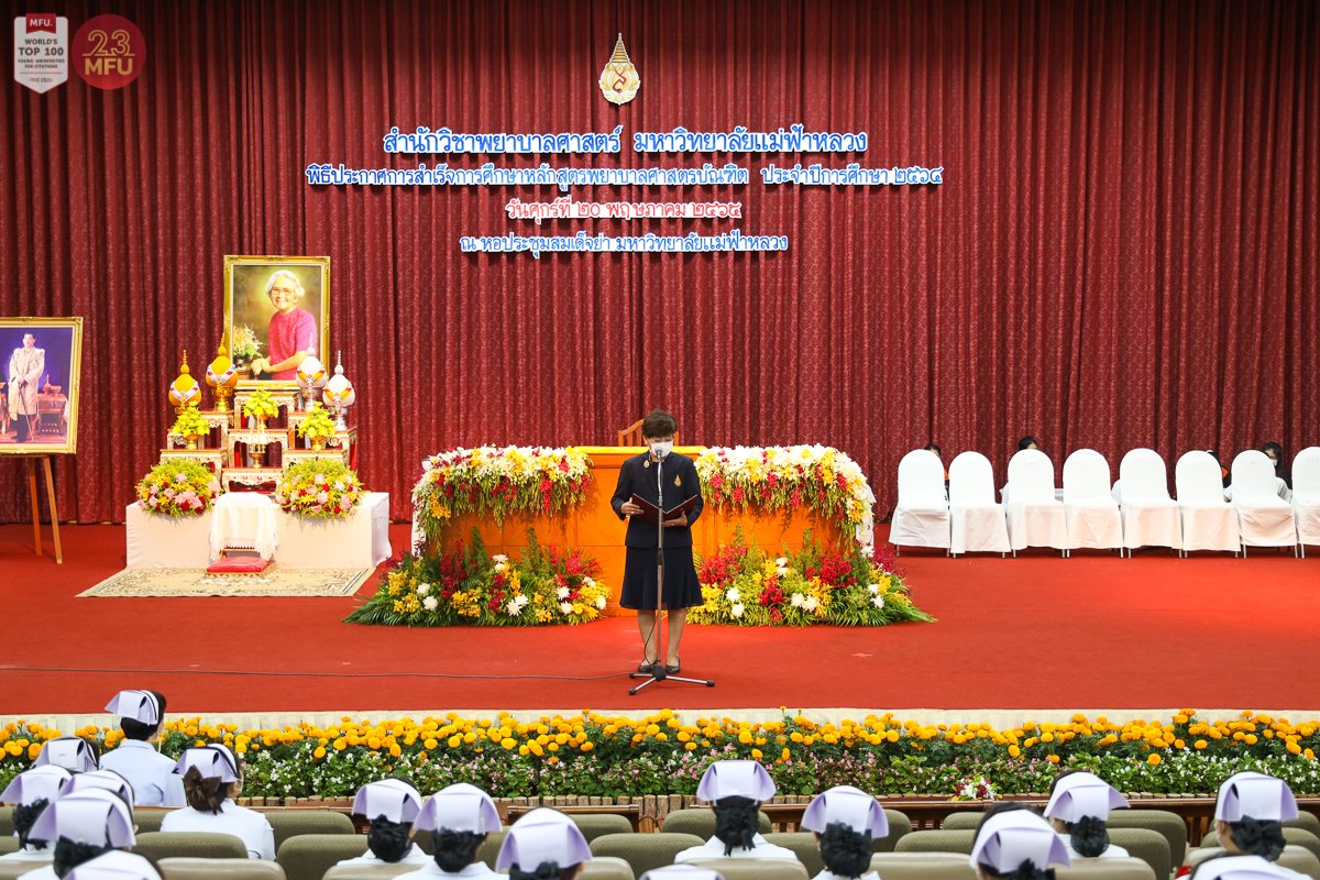 วันนี้ (20 พ.ค. 2565) มหาวิทยาลัยแม่ฟ้าหลวง (มฟล.) โดยสำนักวิชาพยาบาลศาสตร์ จัดพิธีประกาศการสำเร็จการศึกษาของนักศึกษาหลักสูตรพยาบาลศาสตรบัณฑิต ที่หอประชุมสมเด็จย่า มหาวิทยาลัยแม่ฟ้าหลวง เพื่อแสดงความยินดีแก่ผู้สำเร็จการศึกษาก่อนเตรียมก้าวสู่วิชาชีพต่อไป ซึ่งปีนี้เป็นรุ่น 12 มีจำนวน 134 คน ในพิธีการมี รศ.ดร.ชยาพร วัฒนศิริ อธิการบดี ให้ปัจฉิมโอวาทแก่ผู้สำเร็จการศึกษา และ ผศ.ดร.ชมพูนุช โสภาจารีย์ รักษาการแทนคณบดีสำนักวิชาพยาบาลศาสตร์ มอบหมวกพยาบาลและเข็มวิทยฐานะ ก่อนจะกล่าวแสดงความยินดีและให้ปัจฉิมโอวาทแก่ผู้สำเร็จการศึกษาด้วยเช่นกัน ท่ามกลางผู้บริหารและคณาจารย์ที่ร่วมแสดงความยินดี