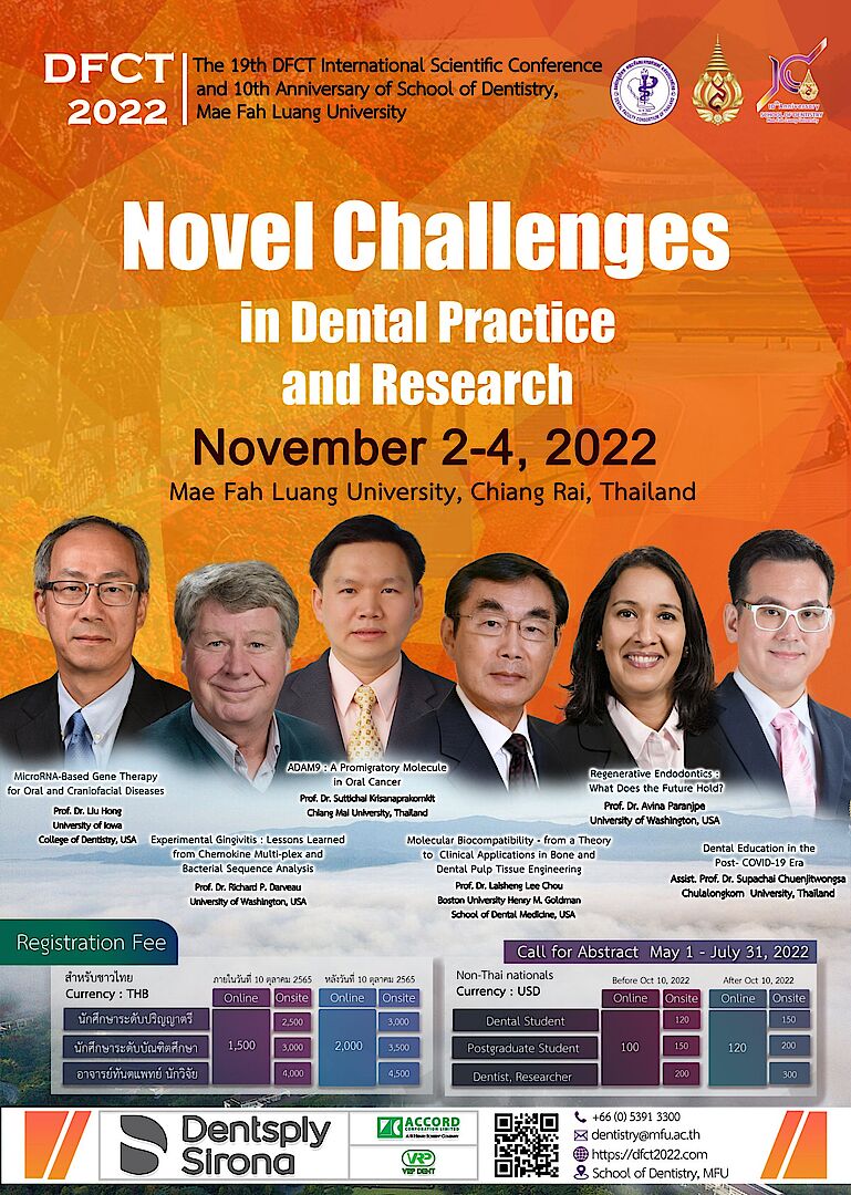 สำนักวิชาทันตแพทยศาสตร์ มหาวิทยาลัยแม่ฟ้าหลวง จัดการประชุมวิชาการระดับนานาชาติ สาขาทันตแพทยศาสตร์องค์กรผู้บริหาร คณะทันตแพทยศาสตร์แห่งประเทศไทย (อ.บ.ท.ท.) ครั้งที่ 19 “The 19th International Scientific Conference of the Dental Faculty Consortium of Thailand (19th# DFCT 2022) & 10th Anniversary of School of Dentistry Mae Fah Luang University”  ในหัวข้อ “Novel Challenges in Dental Practice and Research” ระหว่างวันที่ 2 – 4 พฤศจิกายน 2565 ณ ห้องประชุมประดู่แดง 1 อาคารพลเอกสำเภา ชูศรี (E4) มหาวิทยาลัยแม่ฟ้าหลวง