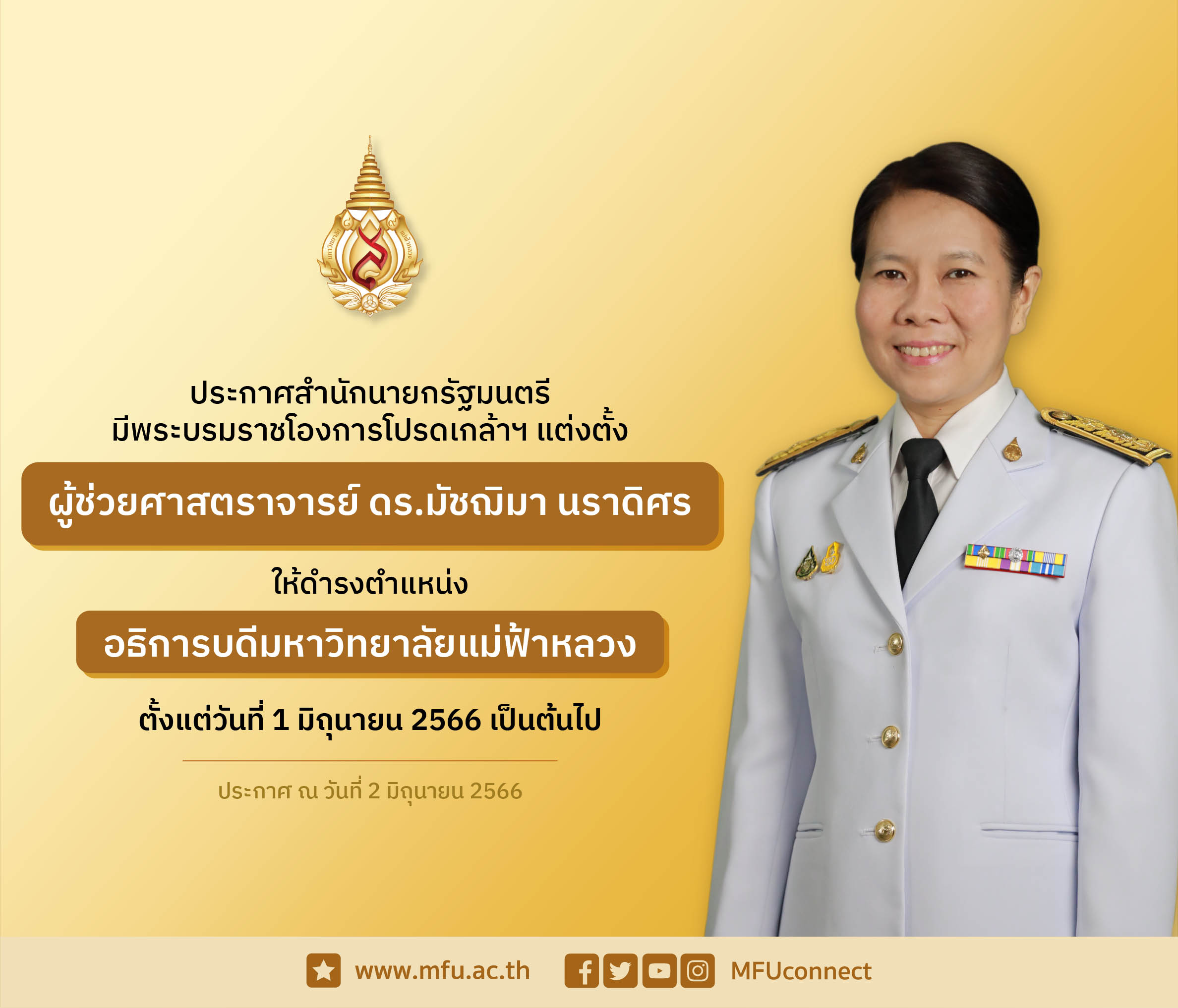 บัดนี้ ได้มีพระบรมราชโองการโปรดเกล้าโปรดกระหม่อมแต่งตั้ง นางสาวมัชฌิมา นราดิศร ให้ดำรงตำแหน่งอธิการบดีมหาวิทยาลัยแม่ฟ้าหลวง ตั้งแต่วันที่ 1 มิถุนายน 2566