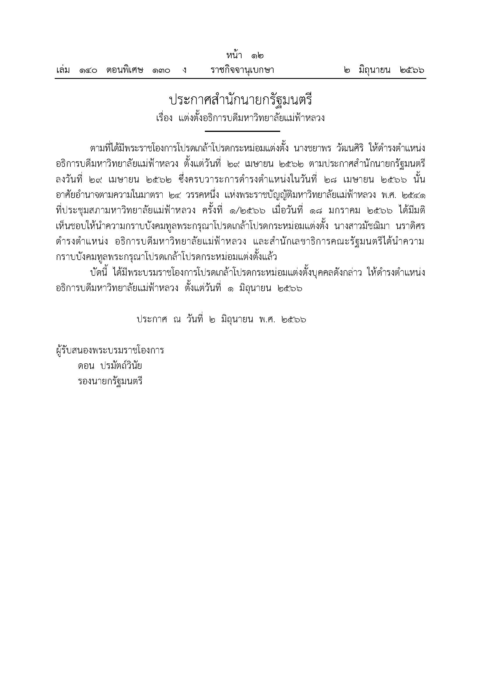 เว็บไซต์ราชกิจจานุเบกษา ประกาศสำนักนายกรัฐมนตรี เรื่อง แต่งตั้งอธิการบดีมหาวิทยาลัยแม่ฟ้าหลวง