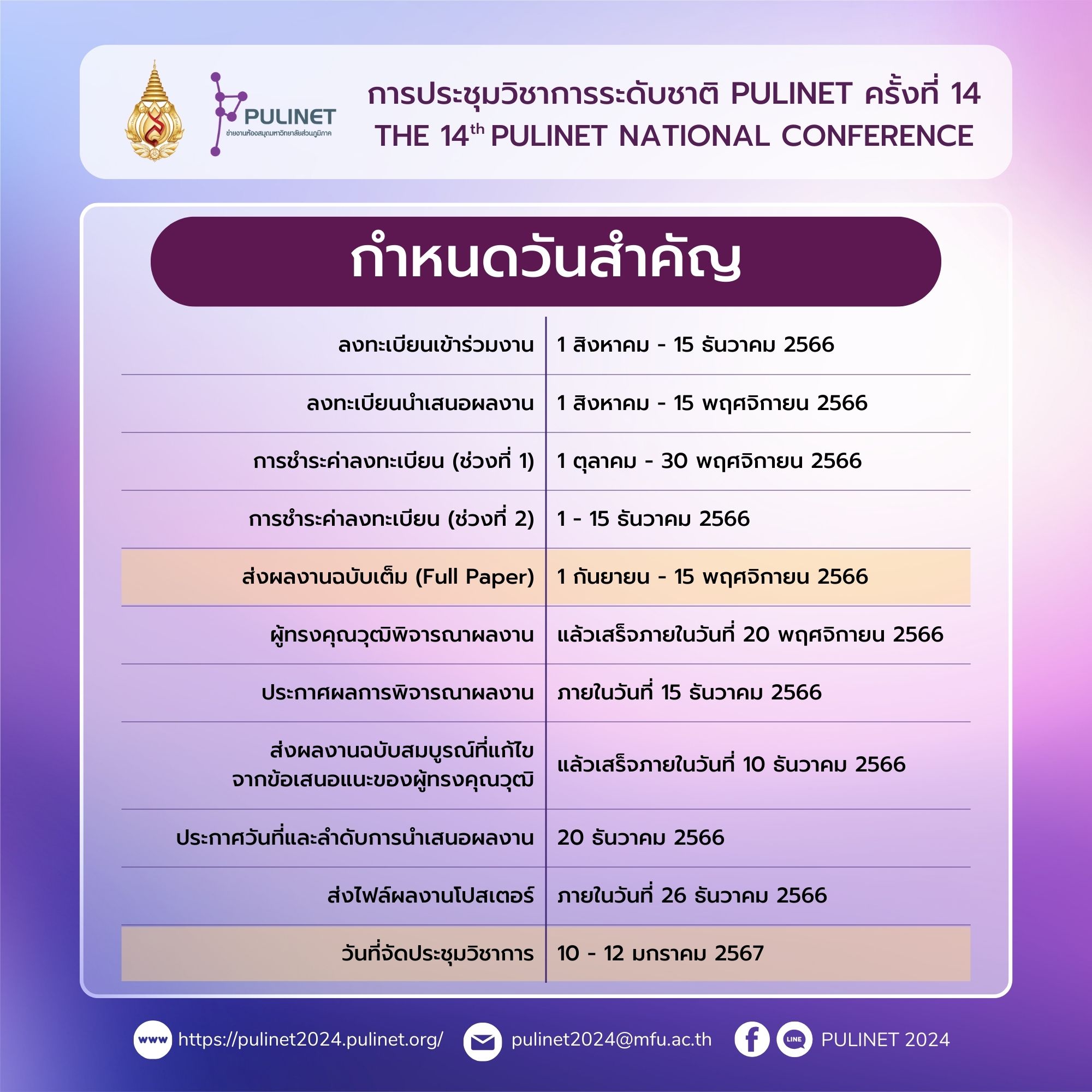 ผู้สนใจสามารถติดตามข่าวประชาสัมพันธ์ข้อมูลต่าง ๆ ผ่านช่องทาง เว็บไซต์ : pulinet2024.pulinet.org หรือ Facebook page : PULINET 2024 : www.facebook.com/PULINET2024