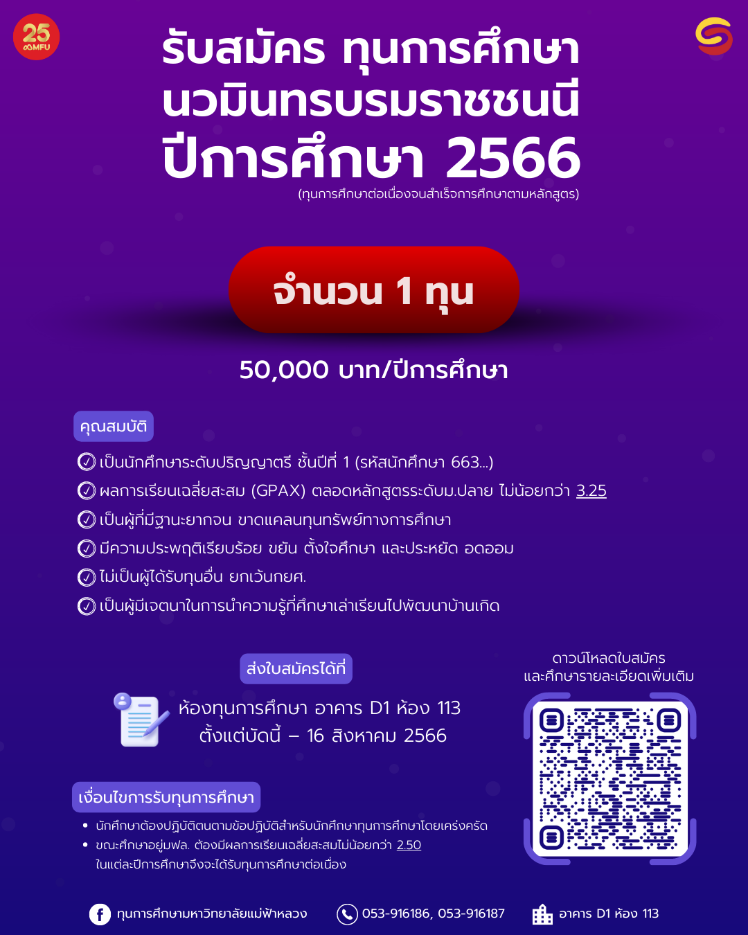 นักศึกษาส่งใบสมัครได้ที่ห้องทุนการศึกษา ห้อง 113 อาคาร D1 ได้ตั้งแต่บัดนี้ – 16 สิงหาคม 2566