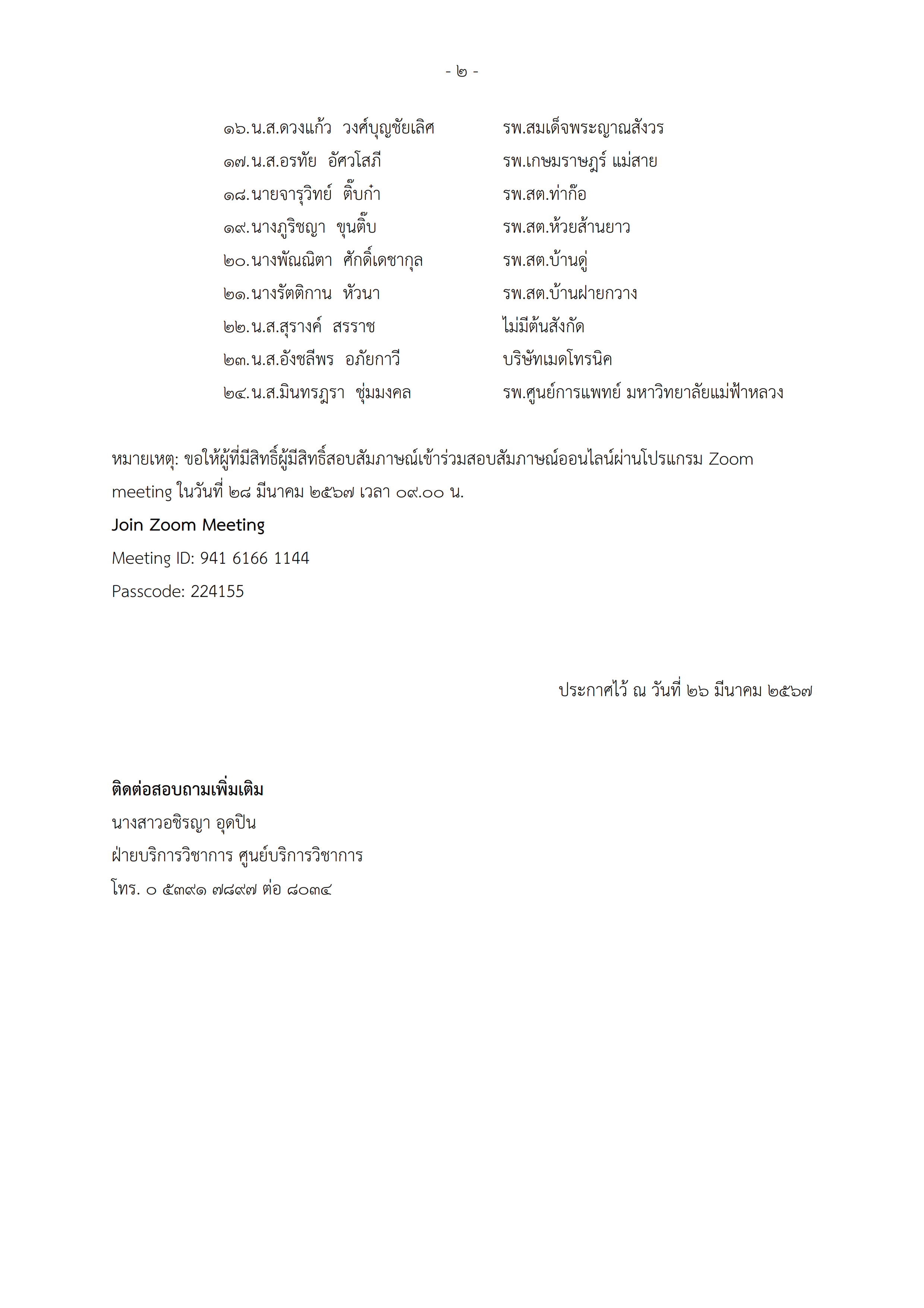 หมายเหตุ: ขอให้ผู้ที่มีสิทธิ์ผู้มีสิทธิ์สอบสัมภาษณ์เข้าร่วมสอบสัมภาษณ์ออนไลน์ผ่านโปรแกรม Zoom meeting ในวันที่ ๒๘ มีนาคม ๒๕๖๗ เวลา ๐๙.๐๐ น.