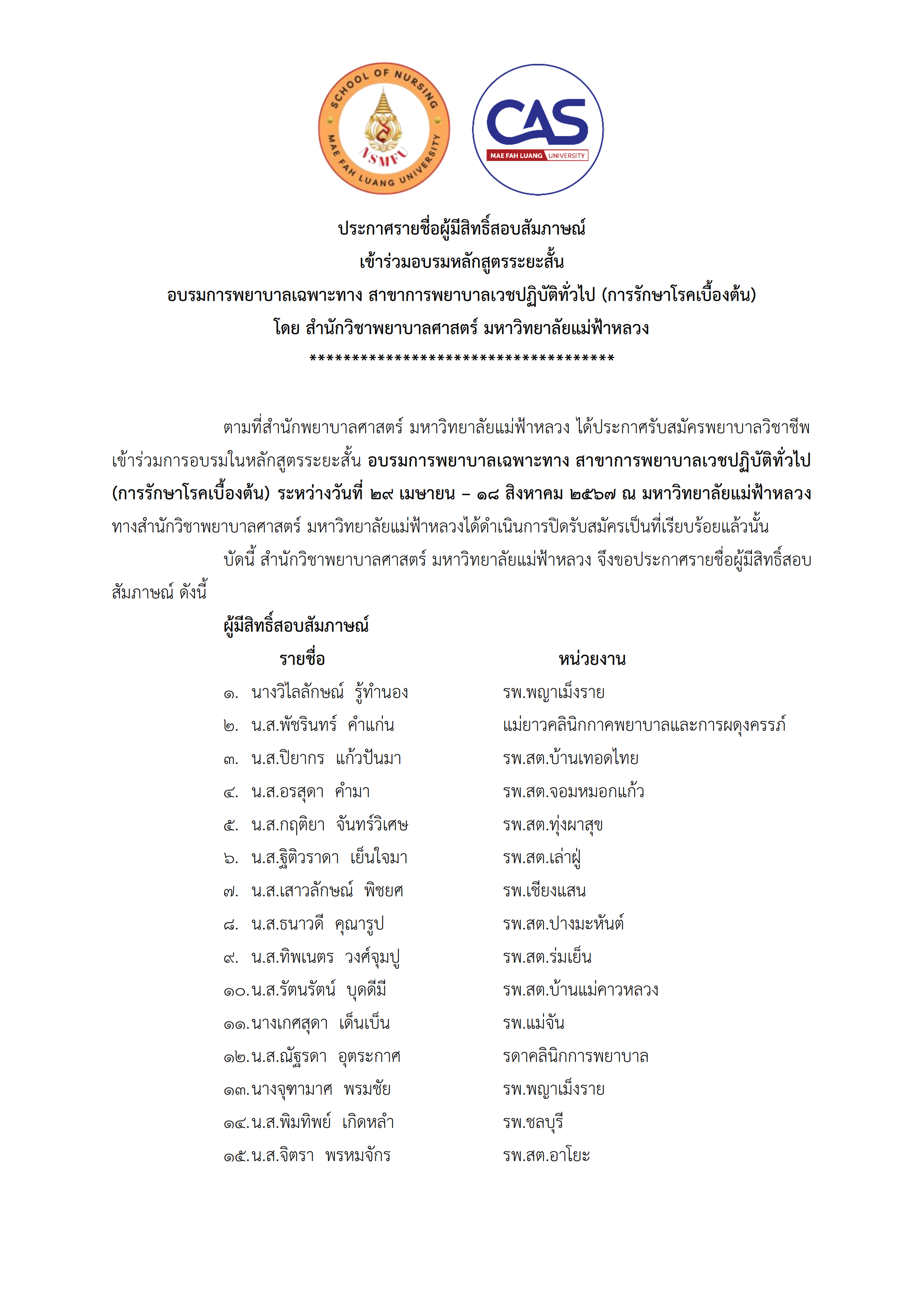 บัดนี้ สำนักวิชาพยาบาลศาสตร์ มหาวิทยาลัยแม่ฟ้าหลวง จึงขอประกาศรายชื่อผู้มีสิทธิ์สอบสัมภาษณ์ ดังนี้