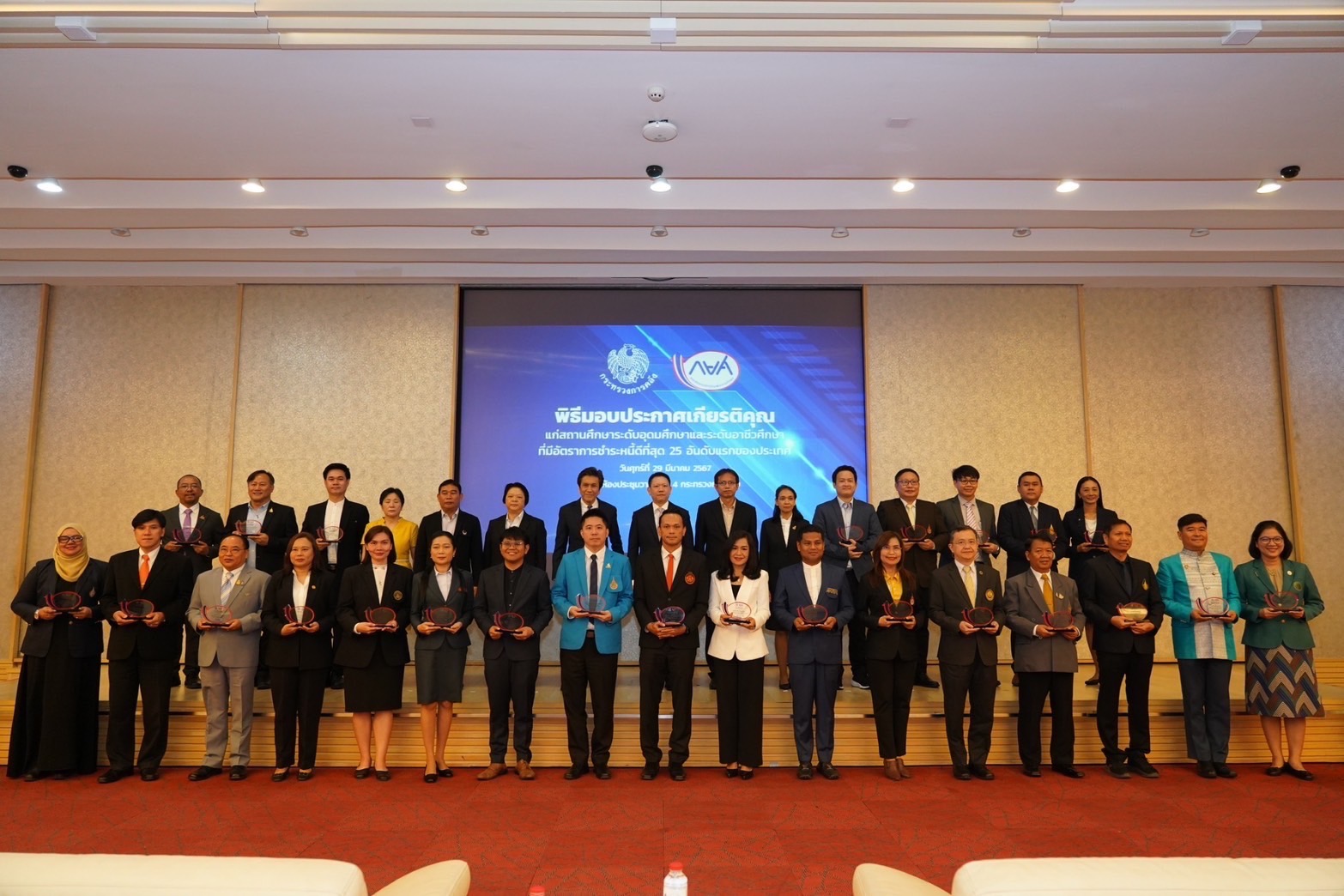 เมื่อวันที่ 29 มีนาคม 2567 ณ ห้องประชุมวายุภักษ์ 4 ชั้น 4 กระทรวงการคลัง กองทุนเงินให้กู้ยืมเพื่อการศึกษา (กยศ.) จัดพิธีมอบประกาศเกียรติคุณแก่สถานศึกษาระดับอุดมศึกษา 25 แห่ง และระดับอาชีวศึกษา 25 แห่ง ที่มีอัตราชำระหนี้ดีที่สุดของประเทศ เพื่อเป็นการยกย่องเชิดชูเกียรติ และสร้างขวัญกำลังใจในการดำเนินงานของสถานศึกษา โดยมีนายลวรณ แสงสนิท ปลัดกระทรวงการคลัง และประธานกรรมการกองทุนเงินให้กู้ยืมเพื่อการศึกษาเป็นผู้มอบรางวัล
