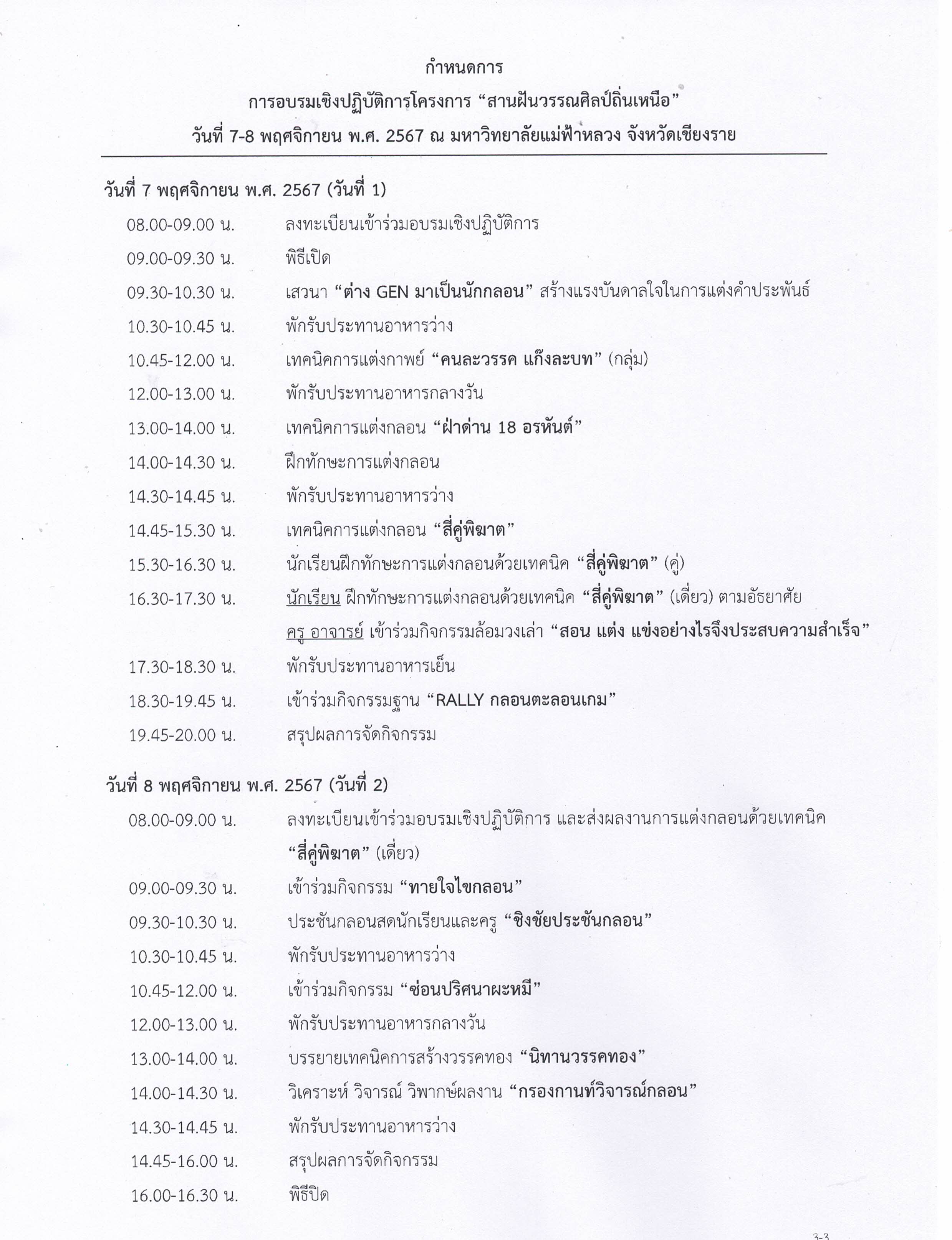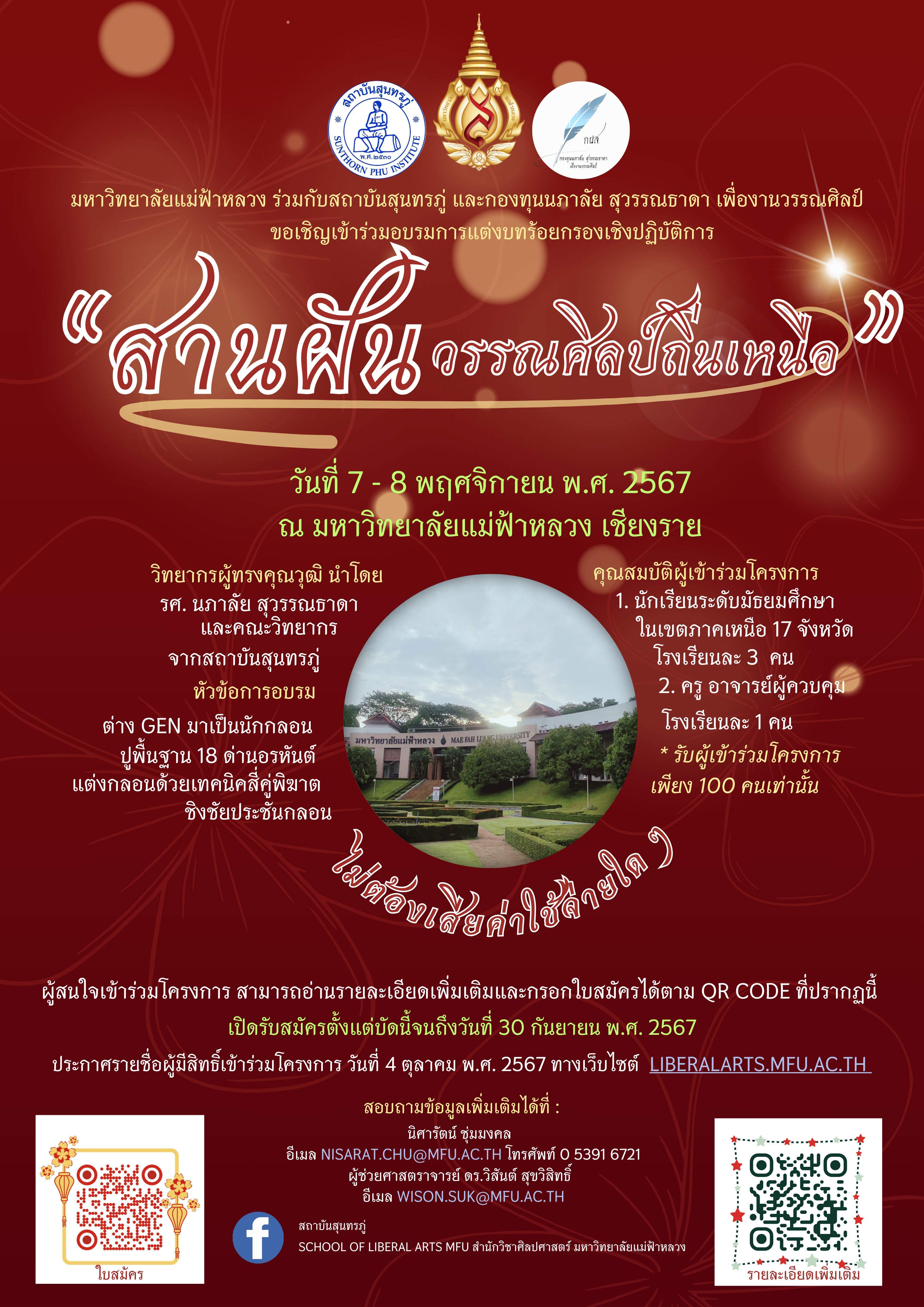 มหาวิทยาลัยแม่ฟ้าหลวง ร่วมกับสถาบันสุนทรภู่ และกองทุนนภาลัย สุวรรณธาดา เพื่องานวรรณศิลป์ ขอเชิญนักเรียนระดับมัธยมศึกษาในเขตภาคเหนือ 17 จังหวัด พร้อมครูอาจารย์ผู้ควบคุม เข้าร่วมการอบรมเชิงปฏิบัติการในโครงการ “สานฝันวรรณศิลป์ถิ่นเหนือ” ประจำปี พ.ศ. 2567 ในระหว่างวันที่ 7-8 พฤศจิกายน พ.ศ. 2567 ณ มหาวิทยาลัยแม่ฟ้าหลวง จังหวัดเชียงราย โดยไม่มีค่าใช้จ่าย