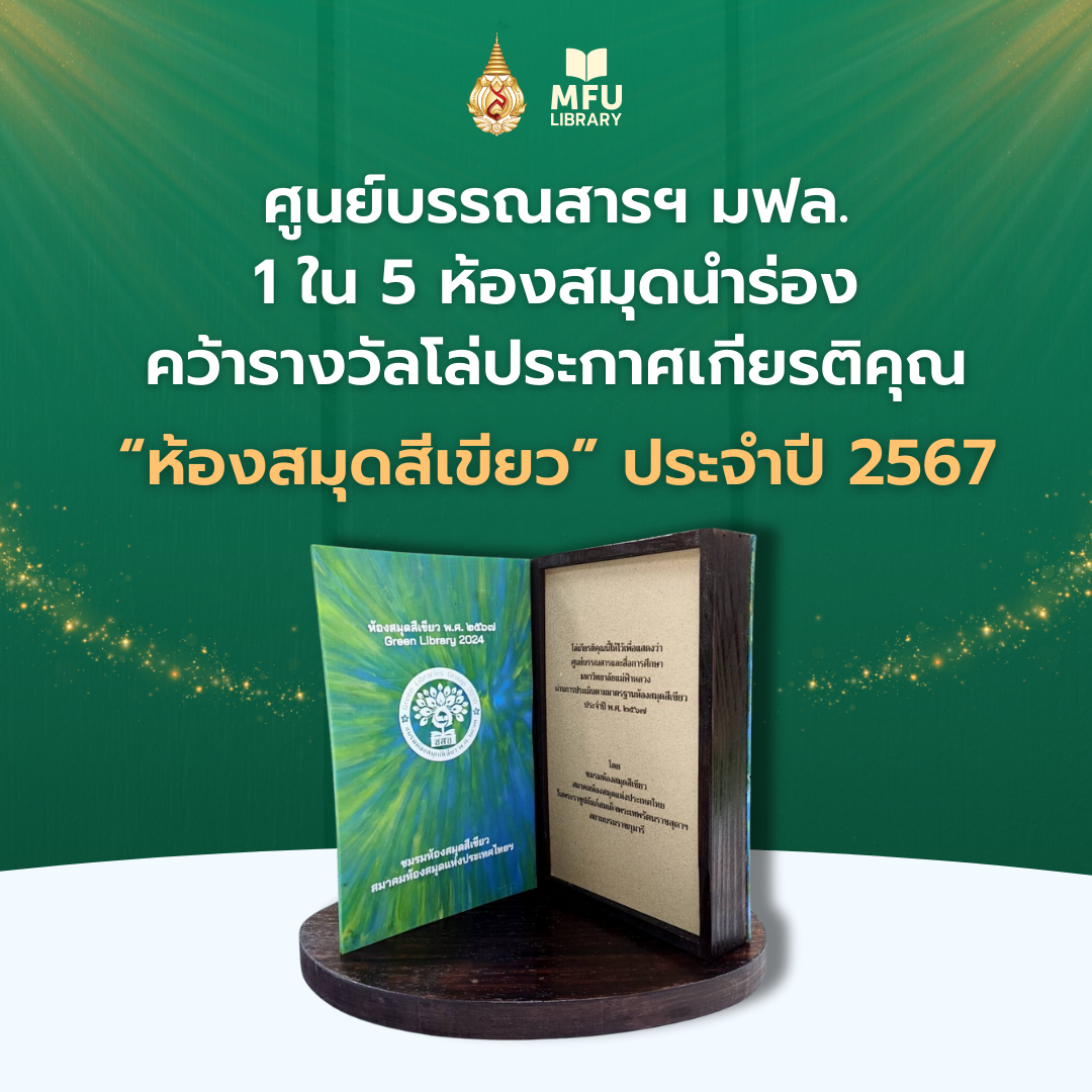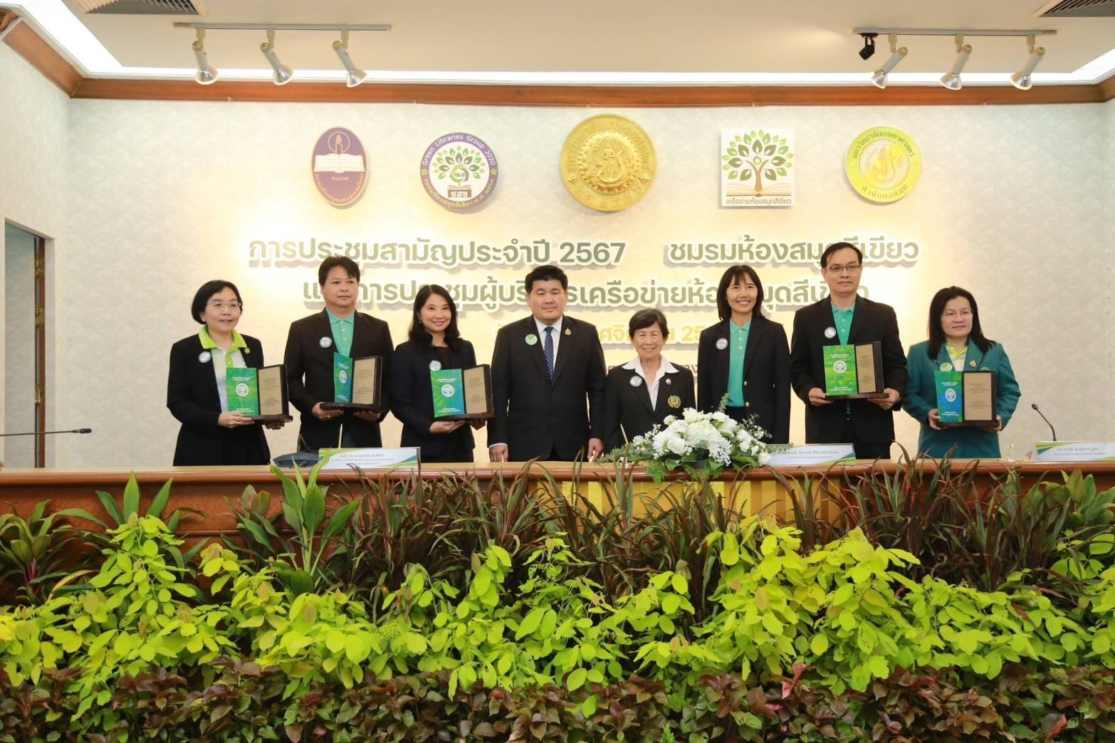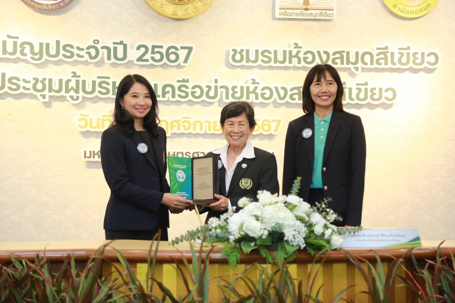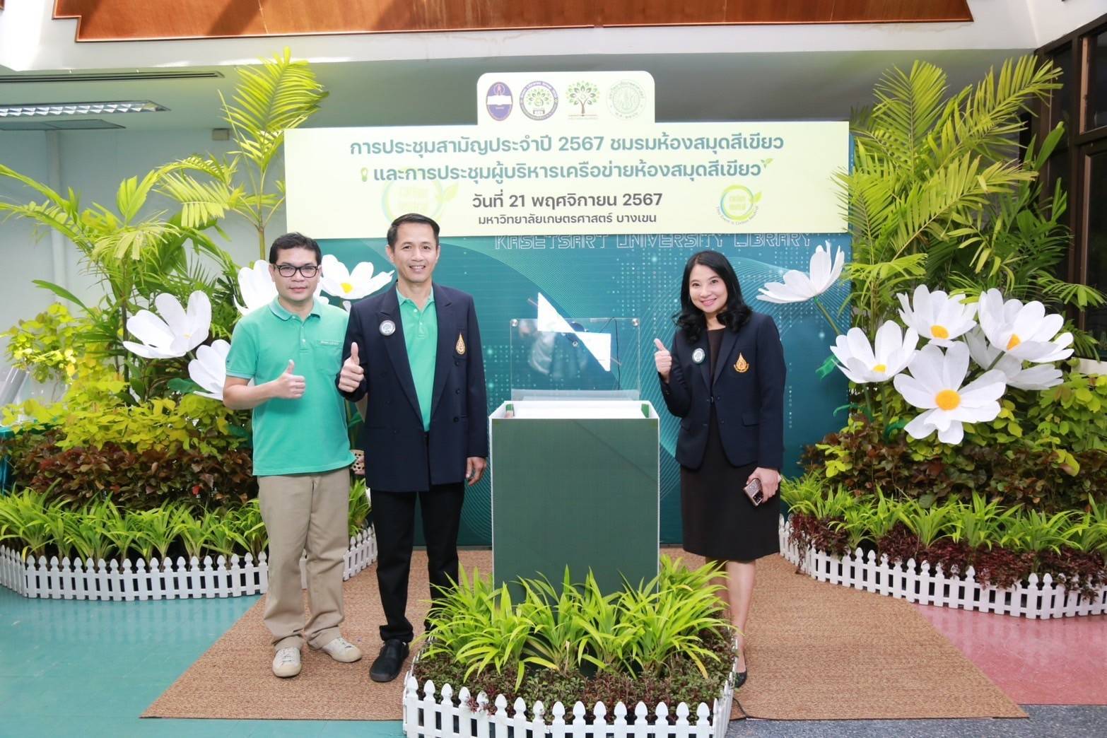 เมื่อวันที่ 21 พฤศจิกายน 2567 ณ ห้องประชุมกำพล อดุลวิทย์ อาคารสารนิเทศ 50 ปี มหาวิทยาลัยเกษตรศาสตร์ บางเขน คุณดาวนภา สุยะนนท์ ผู้อำนวยการศูนย์บรรณสารและสื่อการศึกษา คุณรุ่ง ผู้ค้าขาย ผู้ช่วยผู้อำนวยการศูนย์บรรณสารฯ และคุณดนัทธ์ ไชยสิทธิ์ บรรณารักษ์ เป็นผู้แทนของศูนย์บรรณสารฯ เข้ารับโล่ประกาศเกียรติคุณ “ห้องสมุดสีเขียว” ประจำปี 2567 จากสมาคมห้องสมุดแห่งประเทศไทย ในพระราชูปถัมภ์สมเด็จพระเทพรัตนราชสุดาฯ สยามบรมราชกุมารี (ชมรมห้องสมุดสีเขียว) ทั้งนี้ ศูนย์บรรณสารฯ เป็น 1 ใน 5 ห้องสมุดนำร่องที่ผ่านการรับรองการตรวจประเมินห้องสมุดสีเขียว (ฉบับปรับปรุงใหม่) ซึ่งได้รวมเกณฑ์การประเมินด้านห้องสมุด 35 ตัวชี้วัด และเกณฑ์การประเมินทรัพยากรและสิ่งแวดล้อม ของกรมการเปลี่ยนแปลงสภาพภูมิอากาศและสิ่งแวดล้อม กระทรวงทรัพยากรธรรมชาติและสิ่งแวดล้อม 63 ตัวชี้วัด ทั้งนี้ มีห้องสมุดที่ได้รับโล่ประกาศเกียรติคุณ “ห้องสมุดสีเขียว” ที่ผ่านการตรวจประเมินประจำปี 2567 จำนวน 5 แห่ง ได้แก่