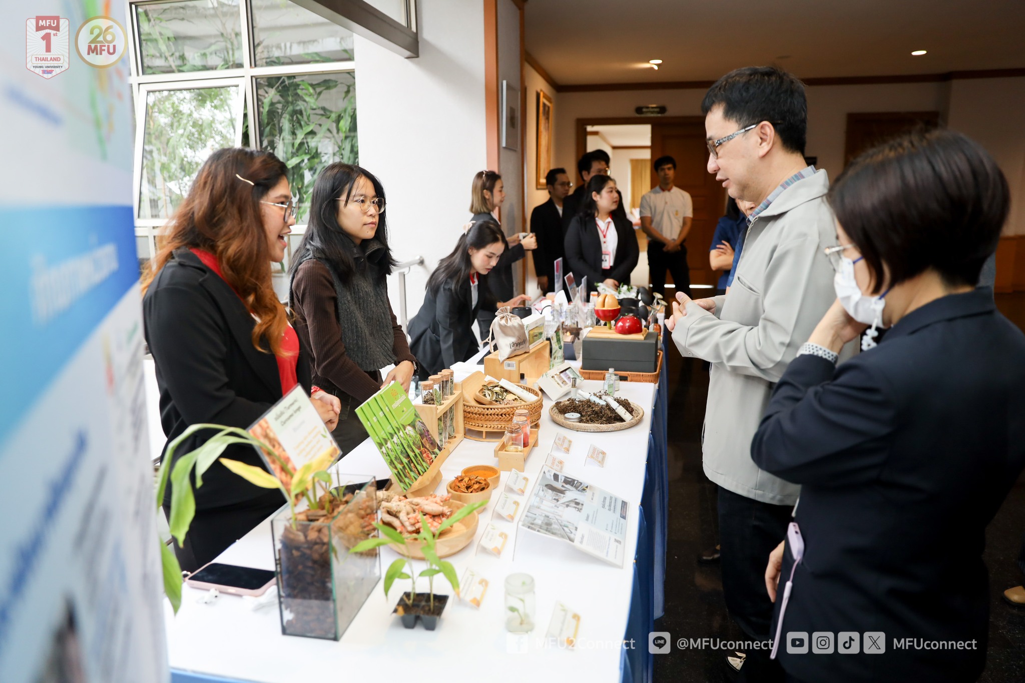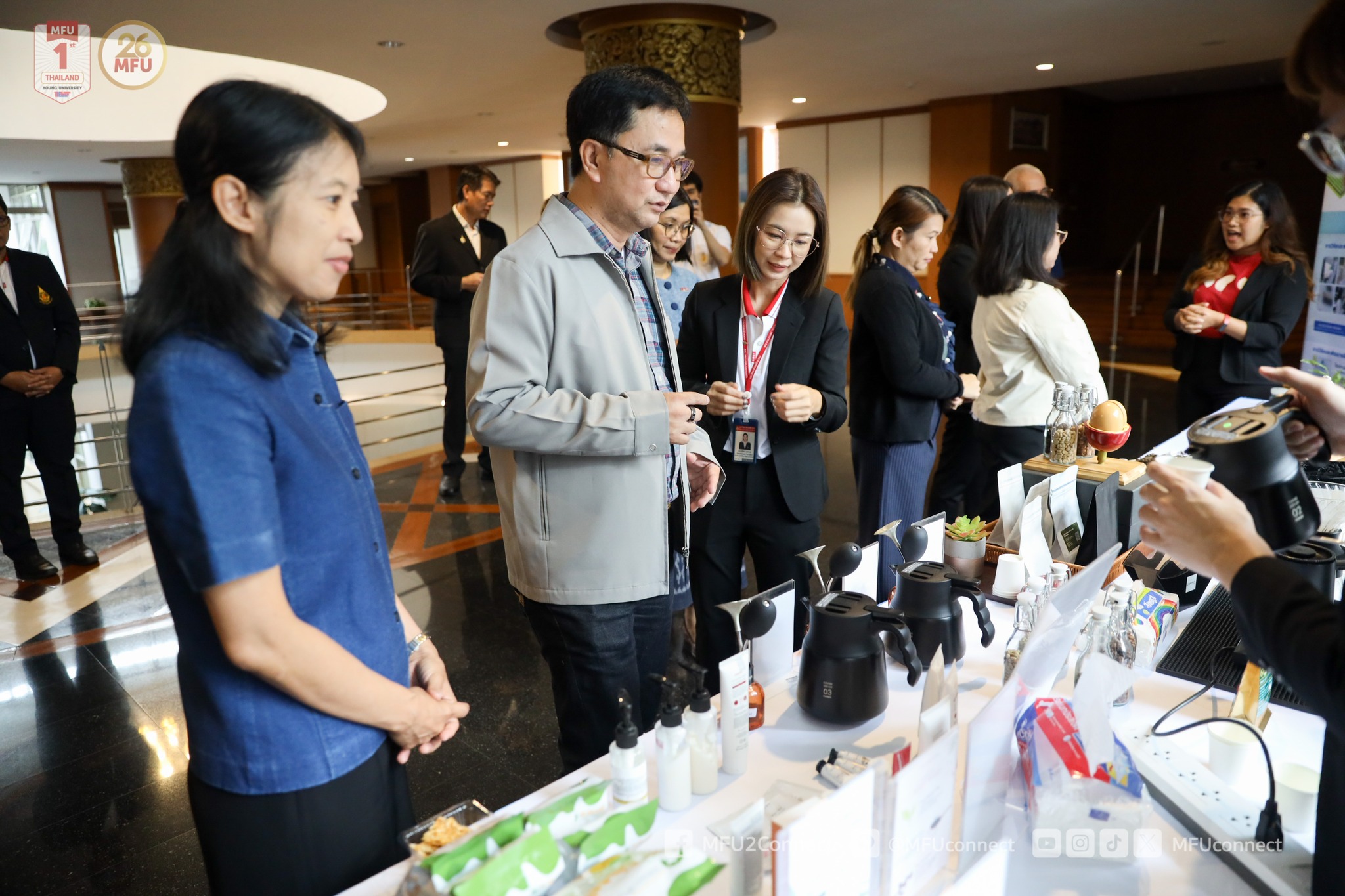 โดยก่อนการเข้าร่วมหารือ ทางมหาวิทยาลัยแม่ฟ้าหลวงได้มีโอกาสจัดบูธนำเสนอผลการดำเนินงานของหน่วยงานที่สนับสนุนด้านการวิจัยของมหาวิทยาลัย คือ ส่วนจัดการทรัพย์สินทางปัญญาและนวัตกรรม (MFii) สถาบันวิจัยและนวัตกรรมมหาวิทยาลัยแม่ฟ้าหลวง ซึ่งได้ร่วมมือกับสำนักวิชาต่าง ๆ ของมหาวิทยาลัย ในการส่งเสริมการวิจัยและต่อยอดนำผลงานวิจัยพัฒนาไปสู่การสร้างผลิตภัณฑ์ต้นแบบ ร่วมกับหน่วยงานที่เกี่ยวข้อง เช่น โรงงานต้นแบบเครื่องสำอางมหาวิทยาลัยแม่ฟ้าหลวง นำองค์ความรู้ไปต่อยอดร่วมกับชุมชนและผู้ประกอบการ ออกไปสู่การสร้างผลิตภัณฑ์ในภาคอุตสาหกิจและภาคอุตสาหกรรม ไม่ว่าจะเป็นชาและกาแฟ อาหาร และเครื่องสำอาง ที่มุ่งเน้นสร้างมูลค่าเพิ่มให้แก่ผลผลิตทางการเกษตรในท้องถิ่น ตั้งแต่เริ่มต้นจนถึงการสร้างตราสินค้าและการทำการตลาด