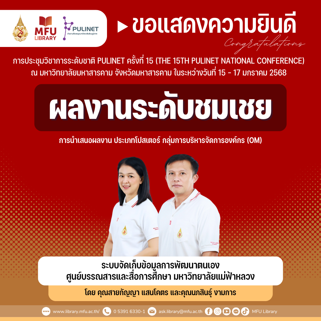 มหาวิทยาลัยแม่ฟ้าหลวงขอแสดงความยินดีกับบุคลากรศูนย์บรรณสารและสื่อการศึกษา มหาวิทยาลัยแม่ฟ้าหลวง คว้า 2 รางวัลใหญ่ ในงานประชุมวิชาการระดับชาติ PULINET ครั้งที่ 15