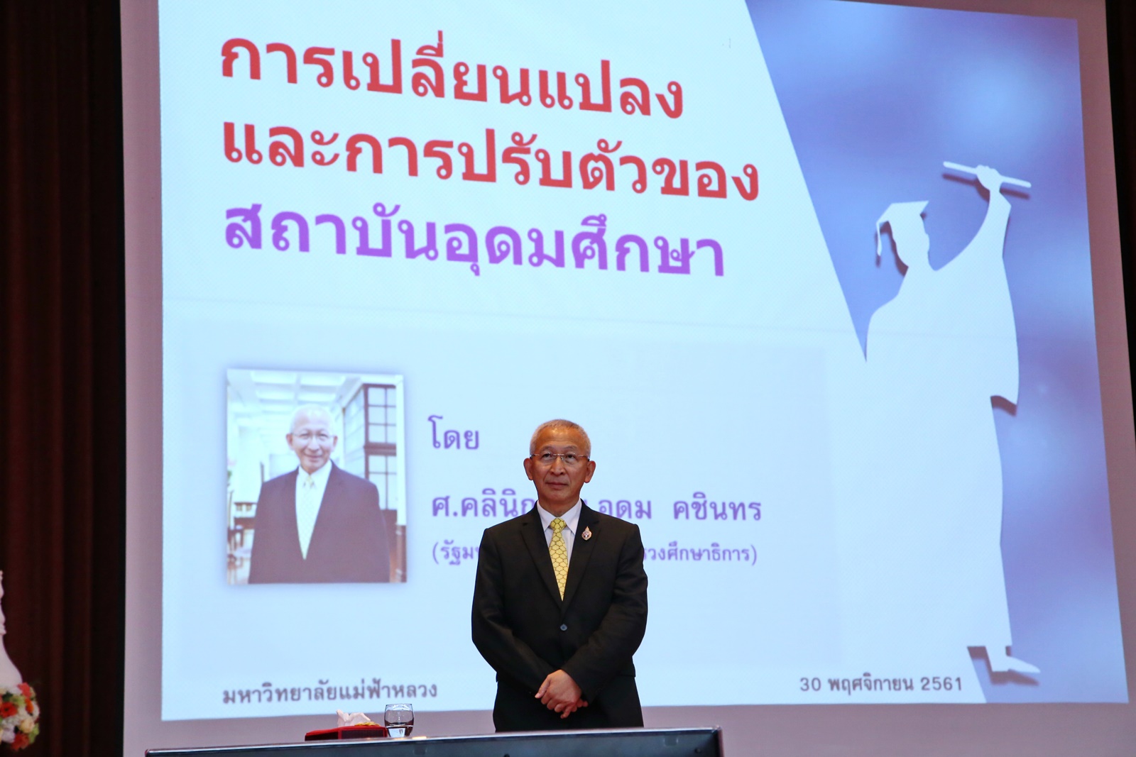 จากนั้นจึงได้เริ่มบรรยายถึง ‘การเปลี่ยนแปลงและการปรับตัวของสถาบันอุดมศึกษา’ โดยได้พูดถึงความเปลี่ยนแปลงต่างๆ ที่เกี่ยวข้อง อย่างการคาดการณ์เกี่ยวกับกำลังคนในอนาคต ยกกรณีธนาคารหลายแห่งที่ลดจำนวนสาขาหรือพนักงานลงเน้นการทำธุรกรรมทางการเงินผ่านระบบออนไลน์ รวมถึงได้ยกข้อมูลจากสำนักงานคณะกรรมการการอุดมศึกษา (สกอ.) ว่านักศึกษาระดับปริญญาตรีลดจำนวนลงเรื่อยๆ รวมถึงระดับสูงกว่าปริญญาตรี อย่างปริญญาโทก็เช่นกันนั้นว่ามีเหตุจากหลายปัจจัย ไม่ว่าจะเป็นอัตราการเกิดลดลงหรือการผลิตกำลังคนไม่ตอบโจทย์ตลาดงาน โดยระบุว่ามีข้อมูลจากบริษัทเอกชนรายใหญ่ให้ความเห็นว่าต้องการให้นักศึกษาใช้เวลาเรียน 50% จากทั้งหมดตลอดหลักสูตร เรียนในสถานประกอบการจริง ผ่านการสอนโดยอาจารย์มหาวิทยาลัยร่วมกับผู้ประกอบการ