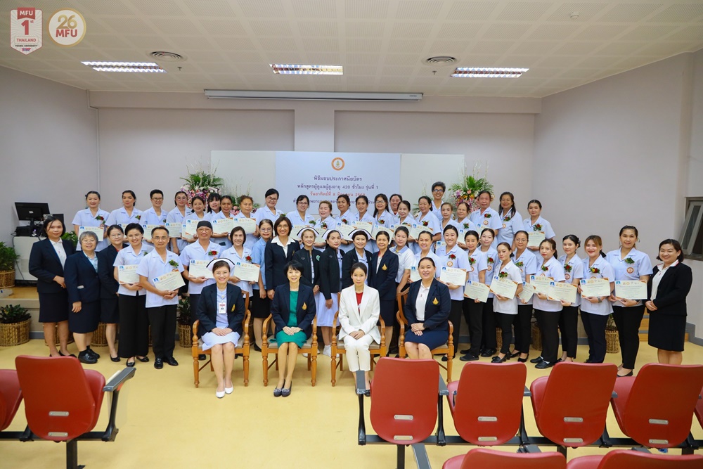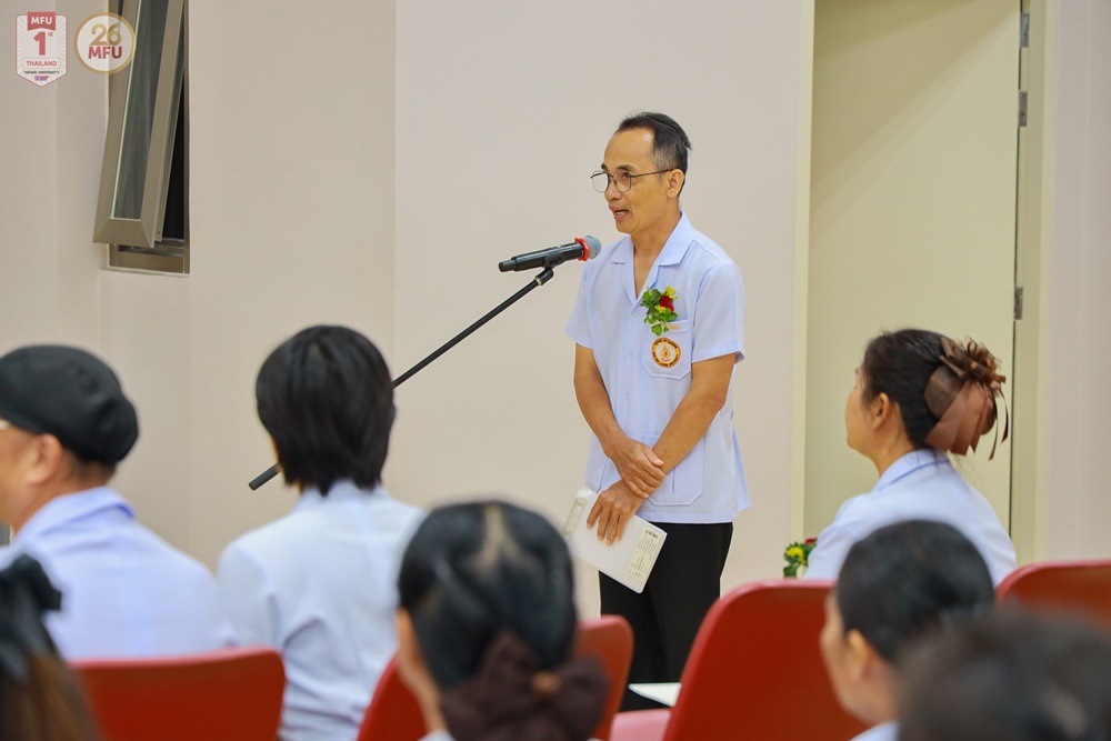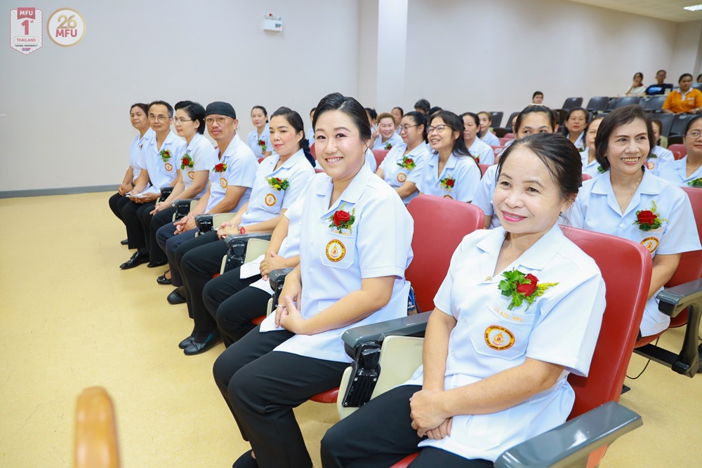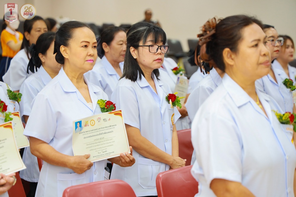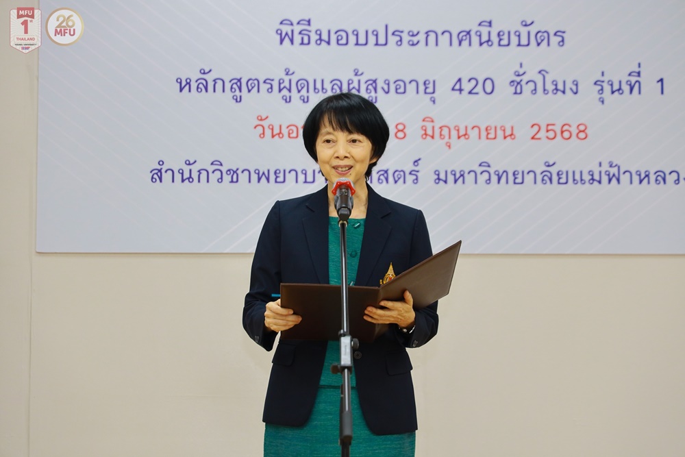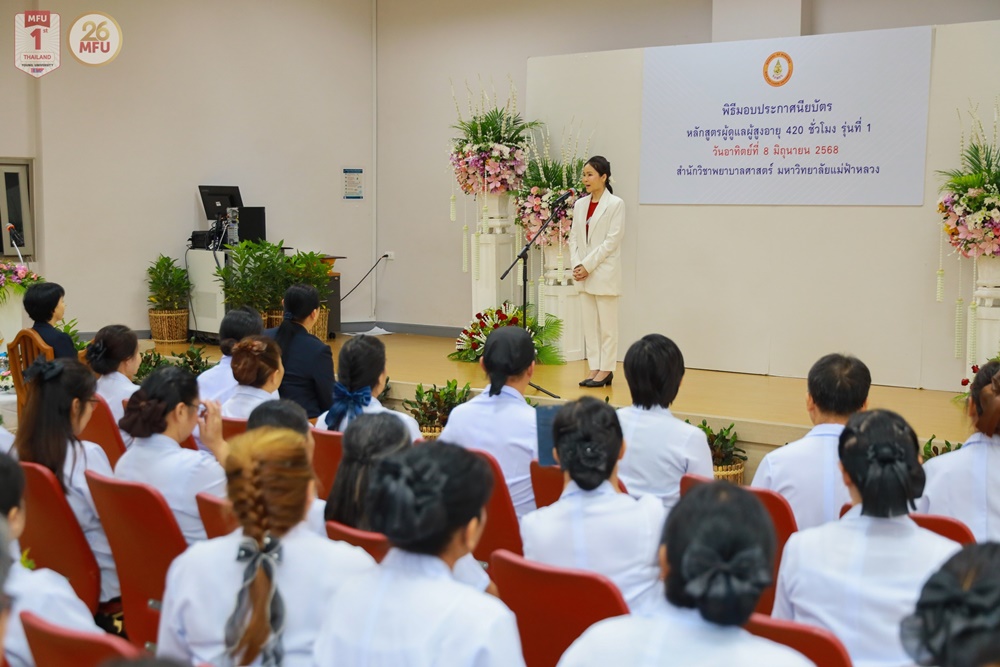 เมื่อวันอาทิตย์ที่ 8 มิถุนายน 2568 สำนักวิชาพยาบาลศาสตร์ มหาวิทยาลัยแม่ฟ้าหลวง ได้จัดพิธีประกาศการสำเร็จการอบรม “หลักสูตรผู้ดูแลผู้สูงอายุ (Care Giver - CG) 420 ชั่วโมง รุ่นที่ 1” ณ ห้อง 811 อาคารพลเอกสำเภา ชูศรี (E4) และบริเวณลานพระราชานุสาวรีย์สมเด็จพระศรีนครินทราบรมราชชนนี โดยมีผู้สำเร็จการอบรมทั้งสิ้นจำนวน 37 ราย