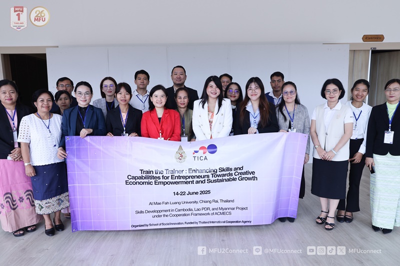 สำนักวิชานวัตกรรมสังคม มหาวิทยาลัยแม่ฟ้าหลวง จัดการอบรมหลักสูตร "Train the Trainer" เพื่อเสริมสร้างศักยภาพผู้ประกอบการหญิงจากกัมพูชา สปป.ลาว และเมียนมา ภายใต้กรอบความร่วมมือ ACMECS ระหว่างวันที่ 14-22 มิถุนายน 2568 ที่ห้องประชุมพวงชมพู-พู่ระหง อาคาร E-Park ชั้น 5 มหาวิทยาลัยแม่ฟ้าหลวง โดยมี ดร.ธนิกุล จันทรา คณบดีสำนักวิชานวัตกรรมสังคม กล่าวต้อนรับและเปิดงาน ดร.จารุวรรณ หัตถผสุ หัวหน้าโครงการ กล่าวรายงาน