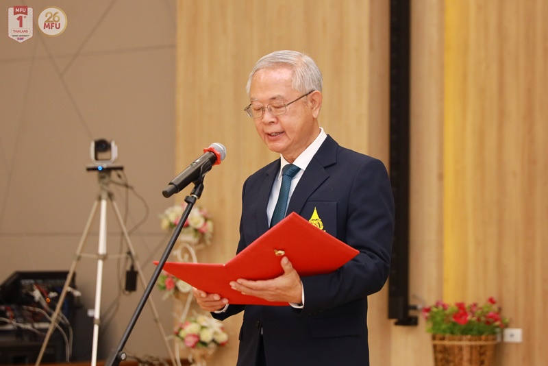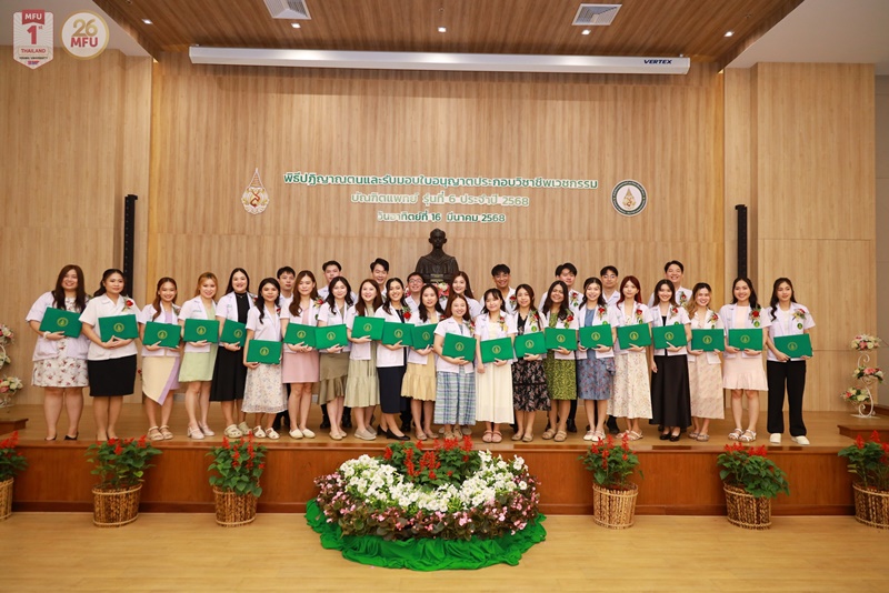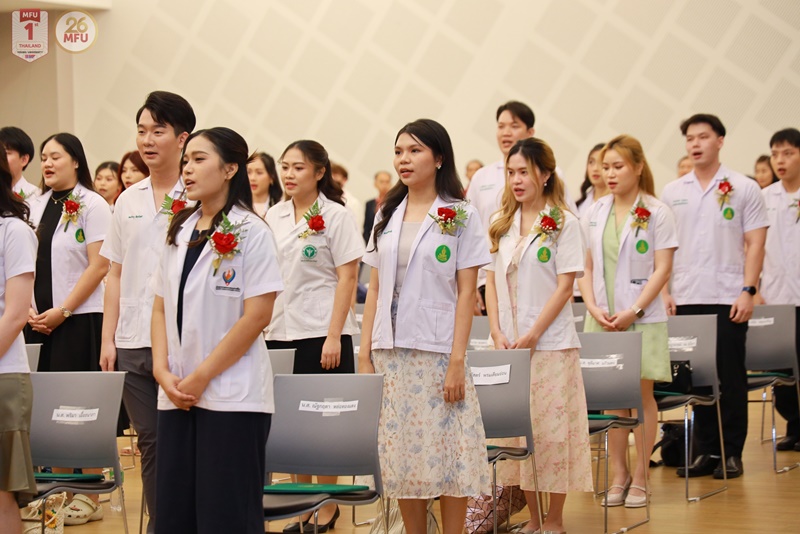 สำนักวิชาแพทยศาสตร์ มหาวิทยาลัยแม่ฟ้าหลวง จัดพิธีปฏิญาณตนและรับมอบใบอนุญาตประกอบวิชาชีพเวชกรรมแก่บัณฑิตแพทย์รุ่นที่ 6 ประจำปี 2568 ในวันอาทิตย์ที่ 16 มีนาคม 2568 ตั้งแต่เวลา 08.30-10.00 น. ณ ห้องประชุม MD-1519 ชั้น 15 อาคารสำนักวิชาแพทยศาสตร์ มหาวิทยาลัยแม่ฟ้าหลวง รศ.นพ.ปรีชา สุนทรานันท์ คณบดีสำนักวิชาแพทยศาสตร์ เป็นประธานในพิธี อาจารย์ ดร.สุรเชษฐ์ วุฒิศิลป์ รองคณบดีฝ่ายบริหาร กล่าวรายงาน