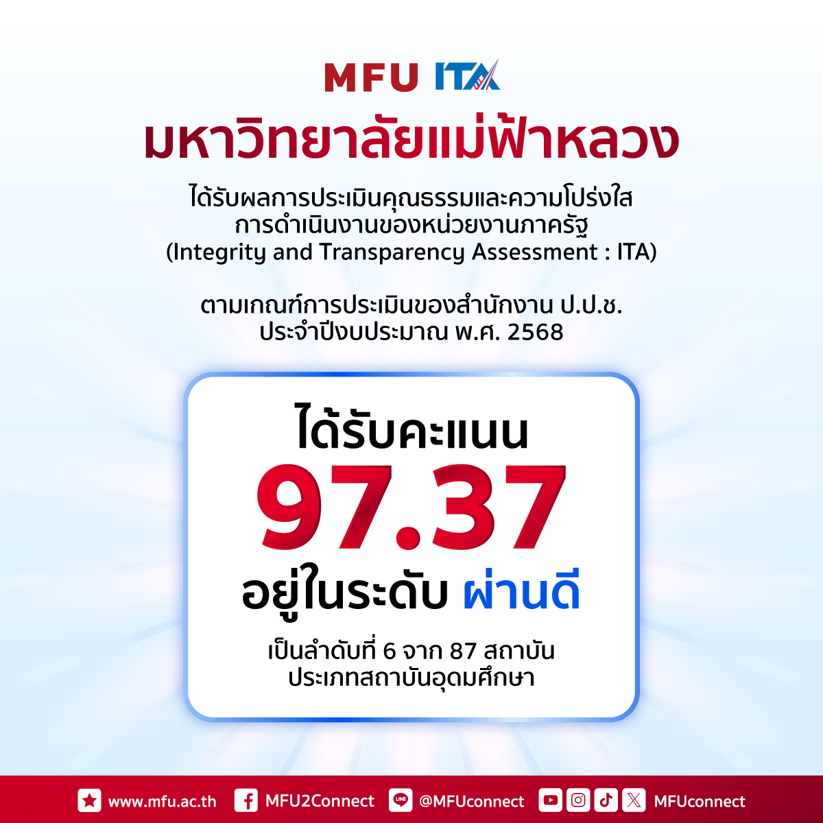 เมื่อวันที่ 15 สิงหาคม 2568 สํานักงานคณะกรรมการป้องกันและปราบปรามการทุจริตแห่งชาติ (สํานักงาน ป.ป.ช.) ได้ประกาศผลการประเมินคุณธรรมและความโปร่งใสในการดําเนินงานของหน่วยงานภาครัฐ (Integrity and Transparency Assessment) หรือการประเมิน ITA ประจำปี 2568 โดยมหาวิทยาลัยแม่ฟ้าหลวง (มฟล.) ได้รับผลการประเมินในระดับ "ผ่านดี" ด้วยคะแนน 97.37 คะแนน โดยมีคะแนน +2.06 คะแนน เปรียบเทียบจากปี 2567 เป็นลำดับที่ 6 จาก 87 สถาบันประเภทสถาบันอุดมศึกษา