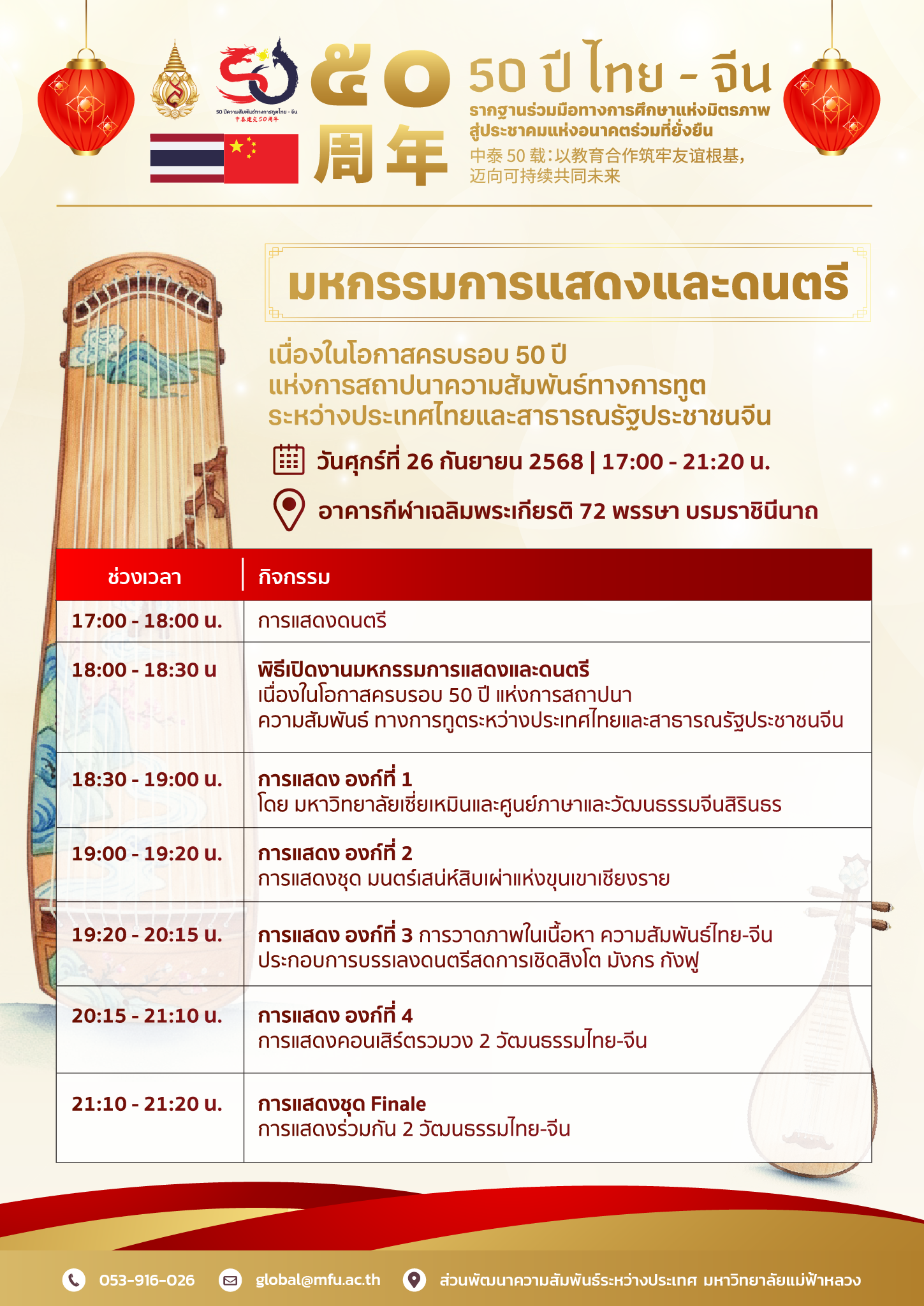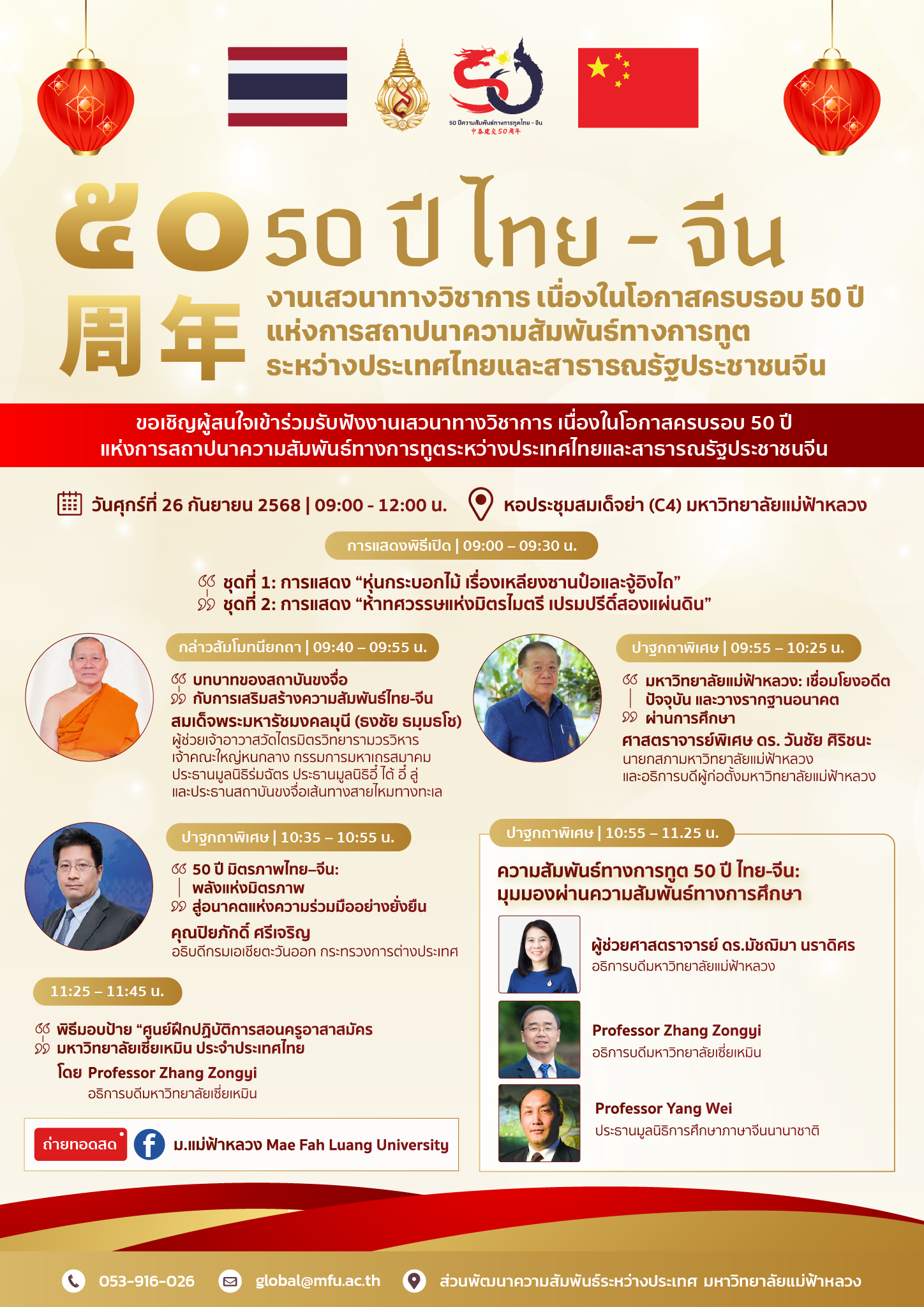 มหาวิทยาลัยแม่ฟ้าหลวงขอเชิญชวนประชาชนทุกท่านร่วมเฉลิมฉลองเหตุการณ์สำคัญทางประวัติศาสตร์ในงาน "50 ปี ไทย-จีน รากฐานความร่วมมือทางการศึกษาแห่งมิตรภาพ สู่ประชาคมแห่งอนาคตร่วมที่ยั่งยืน" ในวันศุกร์ที่ 26 กันยายน 2568 ณ มหาวิทยาลัยแม่ฟ้าหลวง จังหวัดเชียงราย