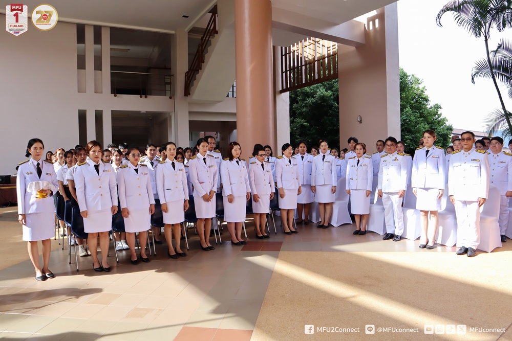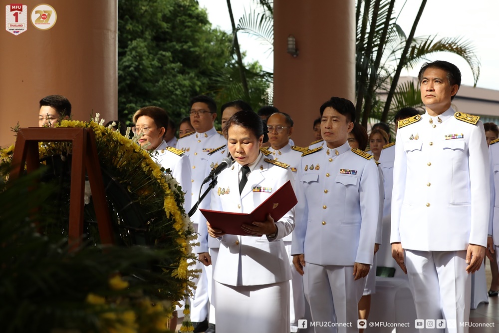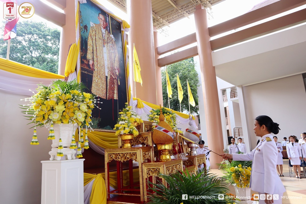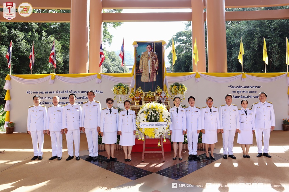 วันศุกร์ที่ 10 ตุลาคม 2568 มหาวิทยาลัยแม่ฟ้าหลวง (มฟล.) จัดพิธีวางพวงมาลา และน้อมรำลึกพระมหากรุณาธิคุณ เนื่องในวันคล้ายวันสวรรคตพระบาทสมเด็จพระบรมชนกาธิเบศร มหาภูมิพลอดุลยเดชมหาราช บรมนาถบพิตร “วันนวมินทรมหาราช” ณ โถงอเนกประสงค์ อาคารเรียนรวม 1 (C1) มหาวิทยาลัยแม่ฟ้าหลวง โดยมี ผู้ช่วยศาสตราจารย์ ดร.มัชฌิมา นราดิศร อธิการบดี เป็นประธานในพิธี พร้อมด้วยคณะผู้บริหาร พนักงาน และนักศึกษา เข้าร่วมพิธีโดยพร้อมเพรียงกัน