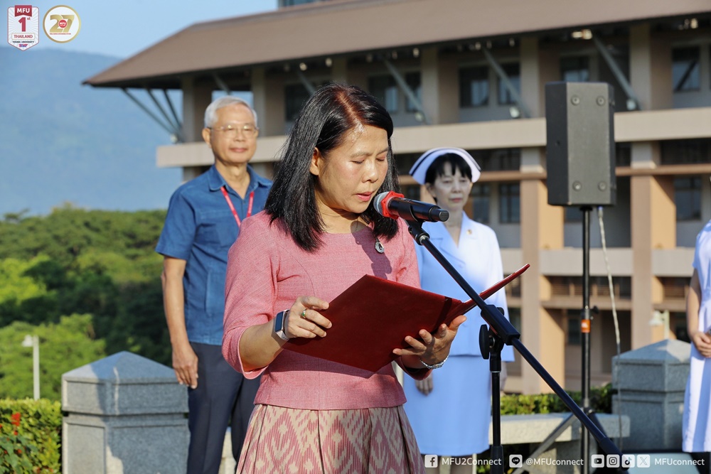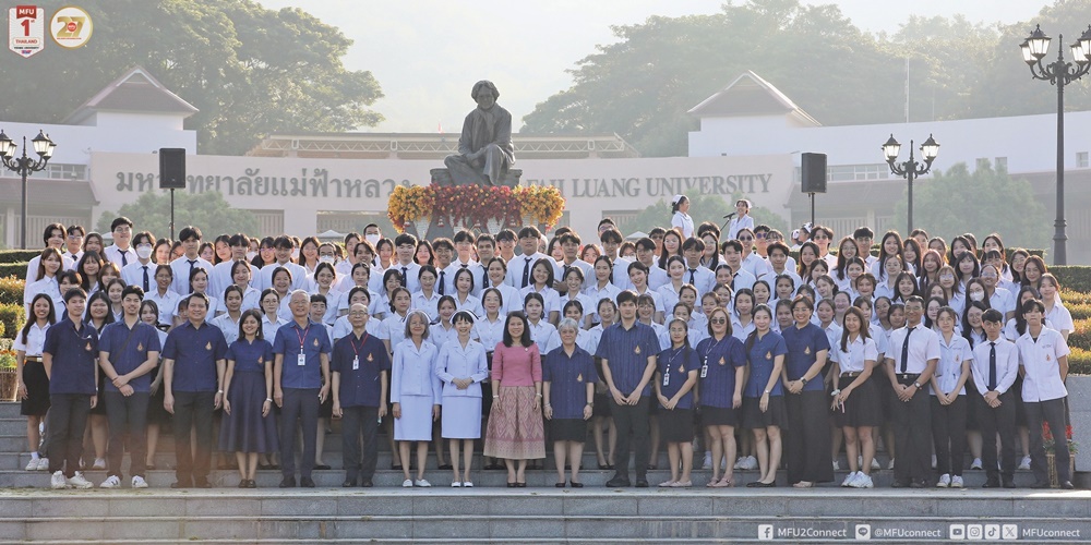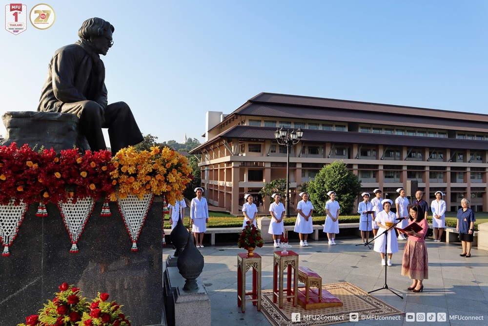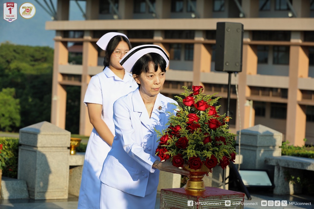 วันอังคารที่ 21 ตุลาคม 2568 สำนักวิชาพยาบาลศาสตร์ ร่วมกับ สำนักวิชาทันตแพทยศาสตร์ มหาวิทยาลัยแม่ฟ้าหลวง จัดพิธีถวายเครื่องสักการะแด่สมเด็จพระศรีนครินทราบรมราชชนนี เนื่องในวันพยาบาลแห่งชาติและวันทันตสาธารณสุขแห่งชาติ ณ ลานพระราชานุสาวรีย์สมเด็จพระศรีนครินทราบรมราชชนนี โดยมี ผศ. ดร.มัชฌิมา นราดิศร อธิการบดีมหาวิทยาลัยแม่ฟ้าหลวง เป็นประธานในพิธี พร้อมด้วย ผศ. ดร.ชมพูนุช โสภาจารีย์ คณบดีสำนักวิชาพยาบาลศาสตร์ อาจารย์ ดร.ทันตแพทย์ณรงค์ ลุมพิกานนท์ คณบดีสำนักวิชาทันตแพทยศาสตร์ ผู้บริหาร คณาจารย์ บุคลากร และนักศึกษามาร่วมพิธีอย่างพร้อมเพรียง เพื่อแสดงความจงรักภักดีและสำนึกในพระมหากรุณาธิคุณของพระองค์ที่ทรงอุทิศพระวรกายในการพัฒนาด้านสาธารณสุขของประเทศอย่างต่อเนื่อง