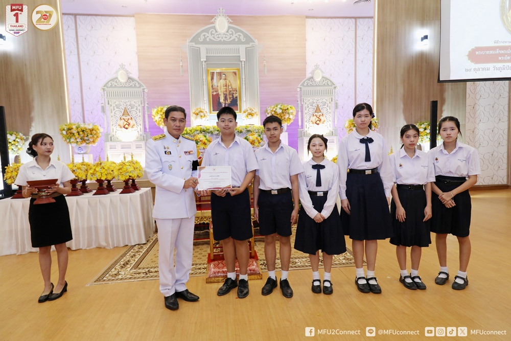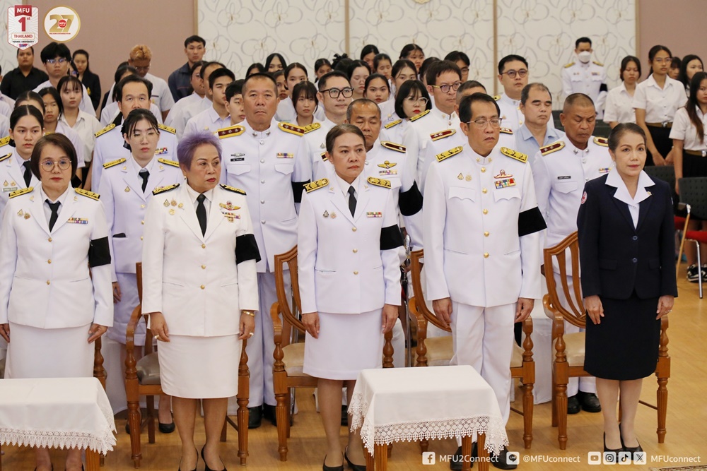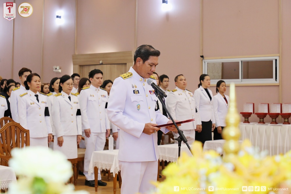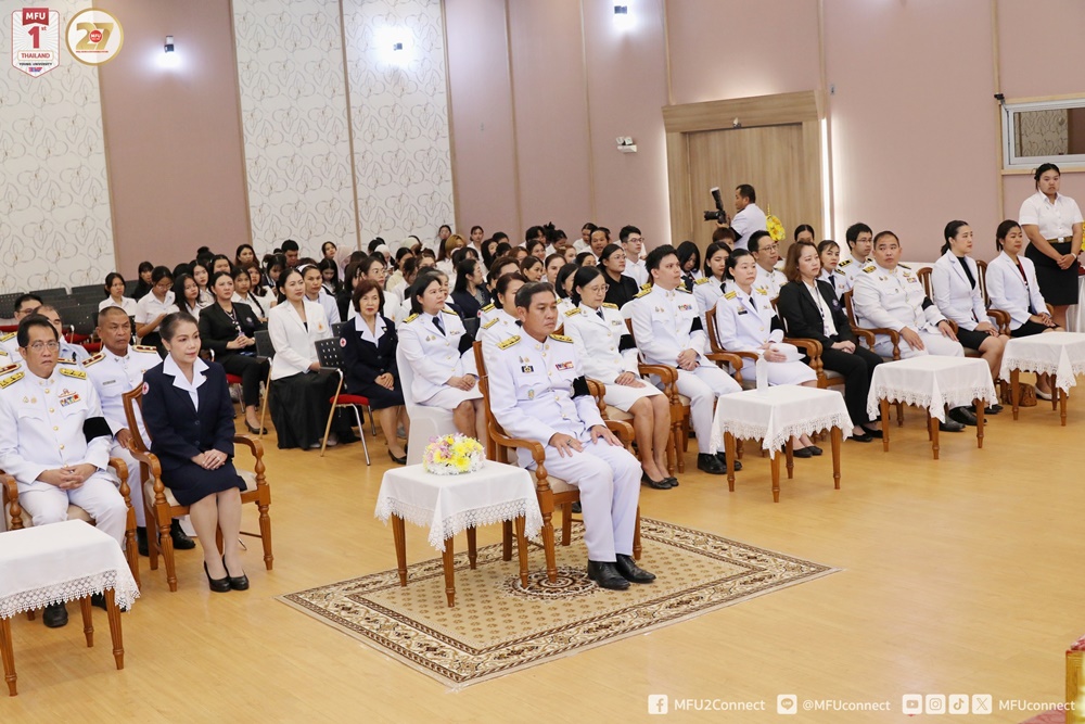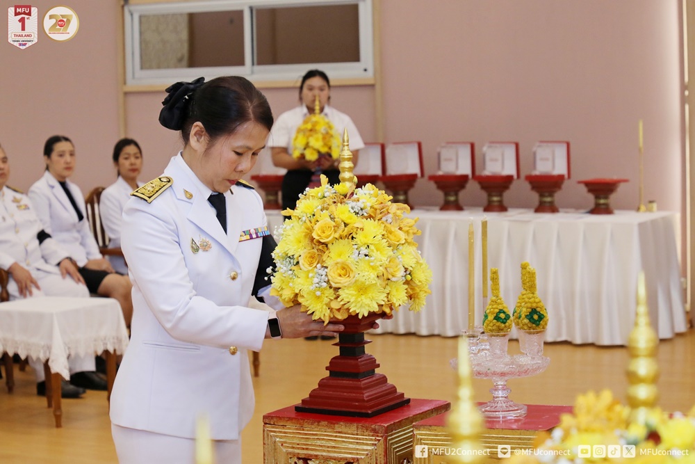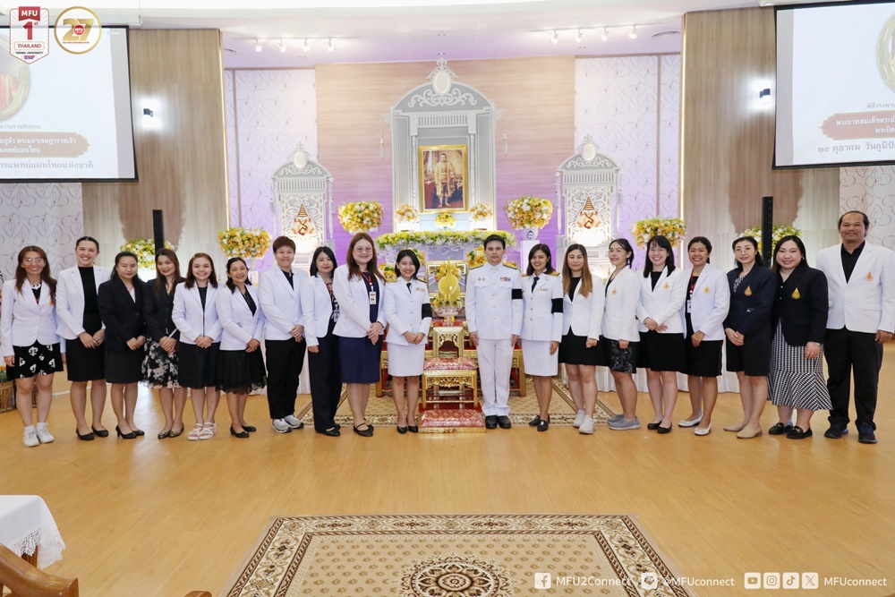 วันพุธที่ 29 ตุลาคม 2568 สำนักวิชาการแพทย์บูรณาการ มหาวิทยาลัยแม่ฟ้าหลวง จัดพิธีวางพานพุ่มดอกไม้ถวายราชสักการะพระบาทสมเด็จพระนั่งเกล้าเจ้าอยู่หัว พระมหาเจษฎาราชเจ้า “พระบิดาแห่งการแพทย์แผนไทย” เนื่องใน “วันภูมิปัญญาการแพทย์แผนไทยแห่งชาติ” ประจำปีพุทธศักราช 2568 โดยได้รับเกียรติจากนายรัฐพล นราดิศร ผู้ว่าราชการจังหวัดเชียงราย เป็นประธานในพิธี พร้อมด้วย ผศ. ดร.มัชฌิมา นราดิศร อธิการบดีมหาวิทยาลัยแม่ฟ้าหลวง คณะผู้บริหารมหาวิทยาลัย คณาจารย์ บุคลากร หน่วยงานราชการ โรงพยาบาลชุมชน และผู้แทนหน่วยงานต่าง ๆ ทั้งภายในและภายนอก เข้าร่วมในพิธีอย่างพร้อมเพรียง ณ ห้องคำมอกหลวง อาคารศูนย์ปฏิบัติการเพื่อพัฒนาการเรียนรู้ (M-Square) มหาวิทยาลัยแม่ฟ้าหลวง