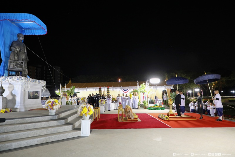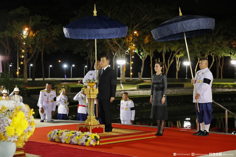 Their Majesties subsequently paid royal homage at the monument and participated in merit-making rites with members of the Sangha. On this occasion, Distinguished Professor Dr. Vanchai Sirichana presented monetary offerings for royal merit-making, while Assistant Professor Dr. Matchima Naradisorn introduced 18 benefactors of Mae Fah Luang University to receive commemorative tokens graciously bestowed by His Majesty in royal recognition.