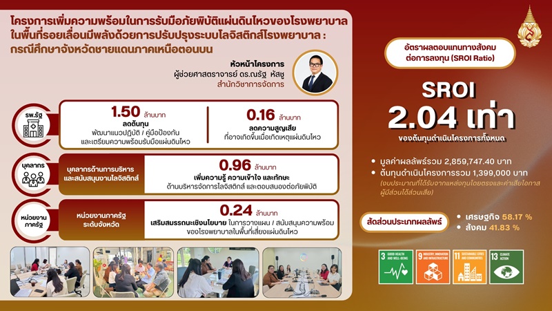 The SROI evaluation results show that six pilot projects generated social and economic value exceeding the initial investment. For the research projects, the outcomes were as follows: Citizen Science and Local Engagement on Climate Adaptation and Water Disaster Mitigation and Adaptation: A Case Study of Ing River Basin (A Major Tributary of the Mekong River in Northern Thailand) recorded an SROI of 3.81; The Enhancement of Hospital Preparedness for Earthquake Disaster Using Hospital Logistics Management: The Case Study of Border City in The North achieved an SROI of 2.04; and Mae Sot, the City of Border Trade, Security and Safety generated an SROI of 1.32.