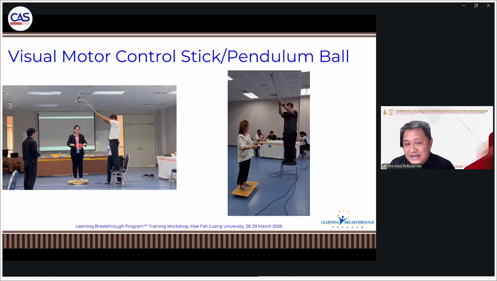 MFU Strengthens Special Education Teachers with "Learning Breakthrough" Batch 2 Training via Online System Mae Fah Luang University, through the School of Anti-Aging and Regenerative Medicine in collaboration with the Center for Academic Services, continues to elevate the potential of educational personnel by organizing the workshop “Professional Teacher Skill Development Project: Physical and Brain Development Training for Learners, Batch 2”. Held between March 28 - 29, 2026, via the Zoom Meeting online platform, the project aims to develop the competencies of special education teachers and related personnel across 9 northern provinces. Participants gained specialized knowledge and expertise in utilizing the Learning Breakthrough Program to effectively rehabilitate physical and brain potential, while enhancing concentration and learning skills for students with special needs.This project received budgetary support from the Mae Fah Luang University Foundation for Rural Teacher Development. The opening ceremony was honored by Jarasphol Rintra, M.D., Dean of the Dean, School of Anti-Aging and Regenerative Medicine, who delivered the welcoming remarks and officially opened the project. He emphasized the importance of applying this knowledge to create behavioral changes and improve guidelines for daily learner care. This approach fosters a better learning environment and ensures learners are developed according to their full potential.Throughout the two-day training, participants received intensive knowledge and practical techniques from a team of expert speakers, including Assoc. Prof. Dr. Phakkharawat Sittiprapaporn and Asst.Prof.Suphaphorn Utsaha. The curriculum covered several key topics:Foundations: Studying Brain & Sensory Integration and the basics of program utilization (How to Use The Program).Practical Techniques: Detailed instruction on Learning Breakthrough Program equipment and daily activity practice (Daily Activities) for weeks 1 through 12.Evaluation: Conducting progress tests and submitting assignments for review to ensure participants can effectively build upon and apply these skills across various teaching levels.This project aligns with the Sustainable Development Goals (SDGs), specifically Goal 4: Quality Education, which focuses on creating inclusive and equitable quality learning opportunities. It also supports Goal 10: Reduced Inequalities by empowering students with special needs to reach their full potential through highly skilled educational personnel.Mae Fah Luang University remains committed to the continuous development of educational personnel in the region to build a collaborative network for special education development and sustainably elevate the quality of Thai education.