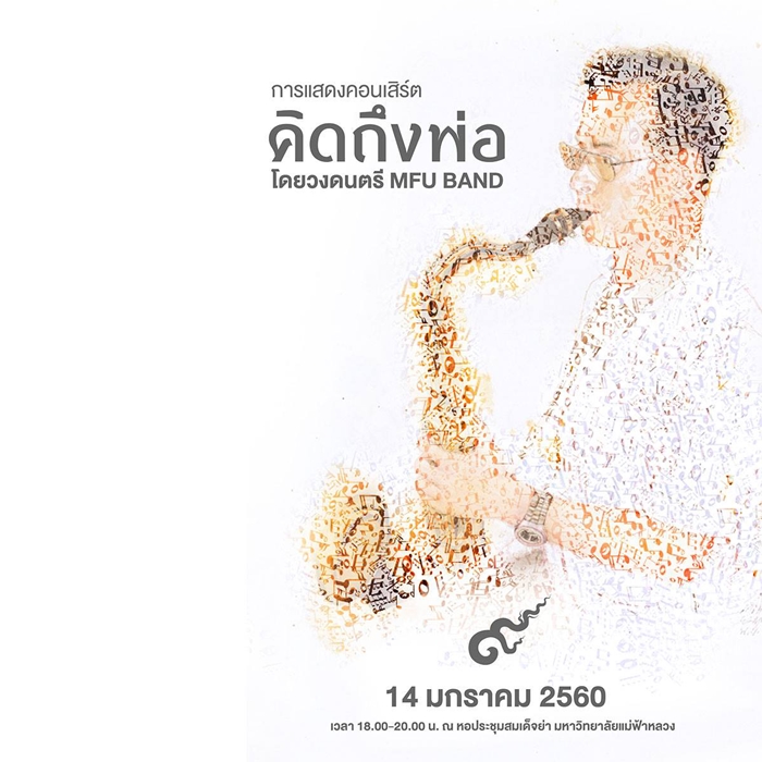 MFU Band วงดนตรีมหาวิทยาลัยแม่ฟ้าหลวง (มฟล.)ขอเชิญชมการแสดงดนตรี “คิดถึงพ่อ” เพื่อน้อมรำลึกในพระมหากรุณาธิคุณของ พระบาทสมเด็จพระปรมินทรมหาภูมิพลอดุลยเดช องค์อัครศิลปินหนึ่งเดียวในโลก ในวันเสาร์ที่ 14 มกราคม 2560 เวลา 18.00-20.00 น. ณ หอประชุมสมเด็จย่า มฟล. โดยไม่เสียค่าใช้จ่าย ซึ่งแบ่งการแสดงออกเป็น 4 ช่วงคือ มหาคีตราชัน, ธ คือ พลังของแผ่นดิน, ธ ดั่งดวงหฤทัย และ ขอเป็นข้ารองบาททุกชาติไป ประกอบด้วยบทเพลงพระราชนิพนธ์และบทเพลงเทิดพระเกียรติ ถ่ายทอดโดยวงดนตรีแจ๊สบิ๊กแบนด์ที่เคยได้รับรางวัลรองชนะเลิศระดับประเทศ จากการประกวดวงดนตรีมหาวิทยาลัยเมื่อปี 2559 ที่ผ่านมา