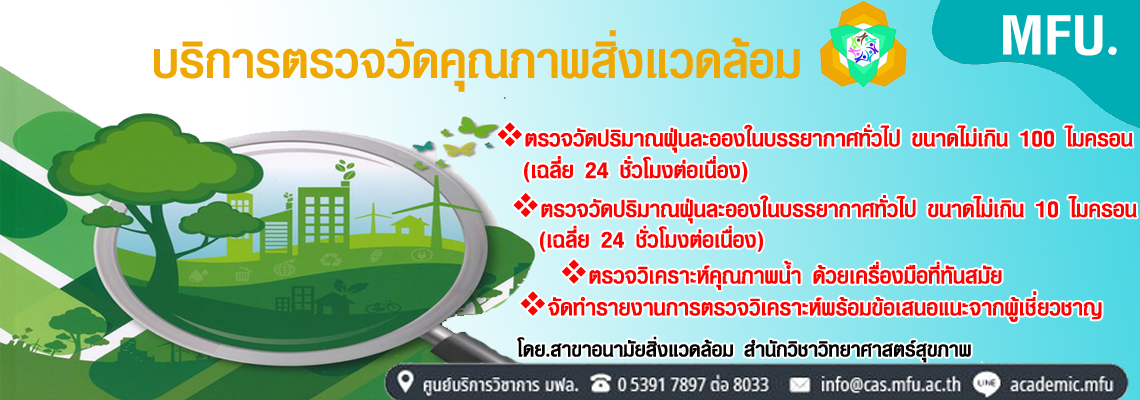 ด้วย สำนักวิชาวิทยาศาสตร์สุขภาพ ร่วมกับ ศูนย์บริการวิชาการ มหาวิทยาลัยแม่ฟ้าหลวง เปิดให้บริการตรวจวัดคุณภาพสิ่งแวดล้อม ให้กับหน่วยงานที่สนใจ ประกอบด้วย