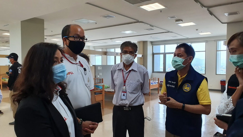 เมื่อวันที่ 11 เมษายน 2564 อาจารย์ ดร.ประภัสสร ดำรงกุล อึ้งวณิชยพันธ์ รองอธิการบดี มหาวิทยาลัยแม่ฟ้าหลวง พร้อมด้วย นายแพทย์สมปรารถน์ หมั่นจิต แพทย์ประจำโรงพยาบาลศูนย์การแพทย์มหาวิทยาลัยแม่ฟ้าหลวง พร้อมคณะผู้บริหาร ให้การต้อนรับนายวรวิทย์ ชัยสวัสดิ์ รองผู้ว่าราชการจังหวัดเชียงราย พร้อมด้วยนายแพทย์วัชรพงษ์ คำหล้า นายแพทย์สาธารณสุขจังหวัดเชียงราย คณะผู้บริหาร และผู้ที่เกี่ยวข้อง ในการตรวจเยี่ยมการเตรียมความพร้อมสถานที่สำหรับรองรับผู้ป่วยโควิด-19 ของโรงพยาบาลศูนย์การแพทย์มหาวิทยาลัยแม่ฟ้าหลวง เพื่อใช้เป็นสถานที่รองรับผู้ป่วย ในกรณีหากพบผู้ติดเชื้อโควิด-19 เพิ่มขึ้นอย่างรวดเร็ว ทำให้เตียงของโรงพยาบาลเชียงรายประชานุเคราะห์ไม่สามารถรองรับได้ โดยโรงพยาบาลศูนย์การแพทย์มหาวิทยาลัยแม่ฟ้าหลวงสามารถรองรับผู้ป่วยได้จำนวน 200 ราย โดยจะแบ่งเป็นหอผู้ป่วยห้องละ 50 ราย แยกหญิงและชาย โดยในแต่ละห้องจะแบ่งโซนละ 7-8 เตียง โดยแต่ละโซนจะมีห้องน้ำแยกเฉพาะ ทั้งนี้จะเป็นการทำงานร่วมกันระหว่าง สาธารณสุขจังหวัดเชียงราย โรงพยาบาลเชียงรายประชานุเคราะห์ และโรงพยาบาลศูนย์การแพทย์มหาวิทยาลัยแม่ฟ้าหลวง